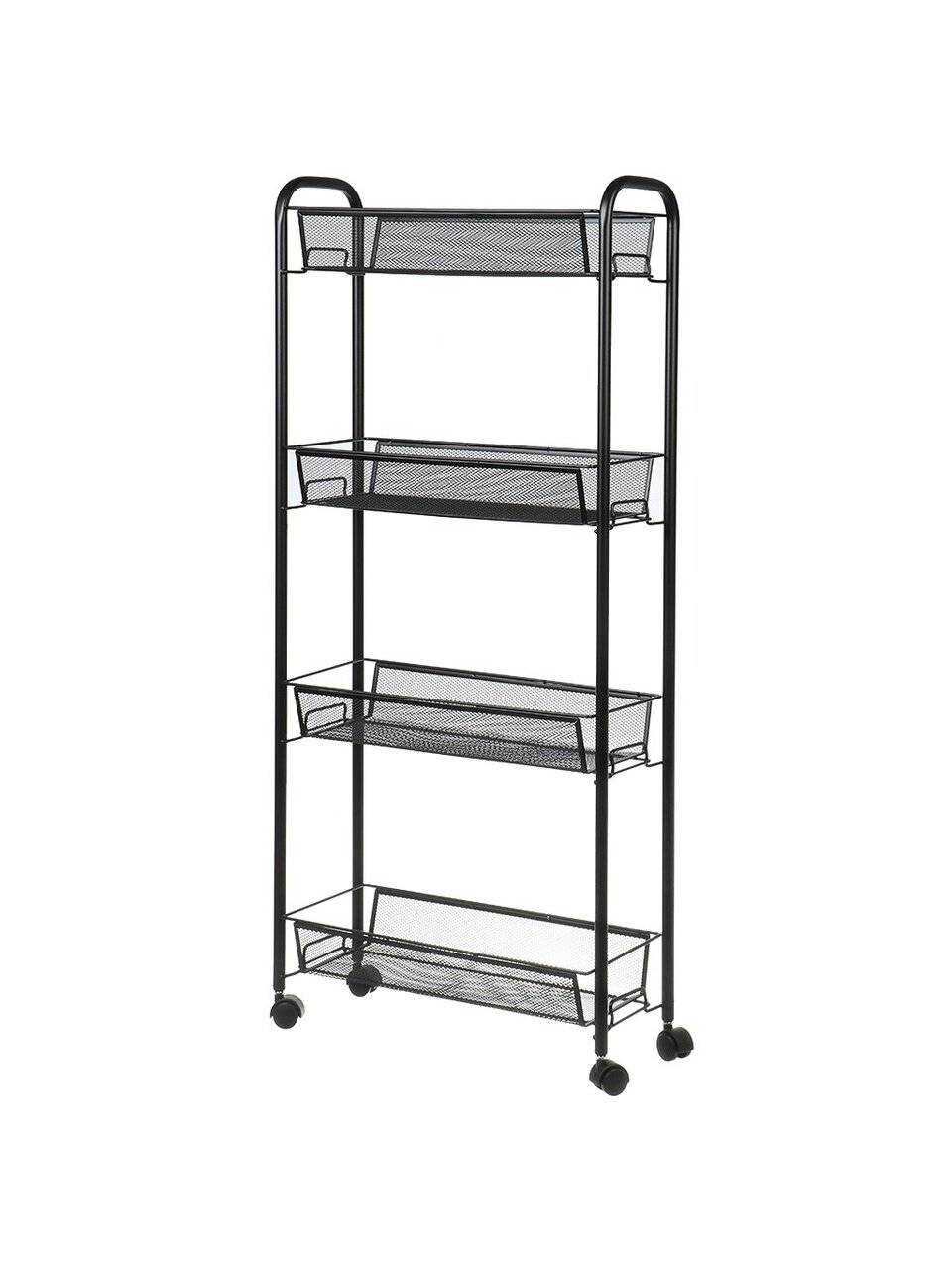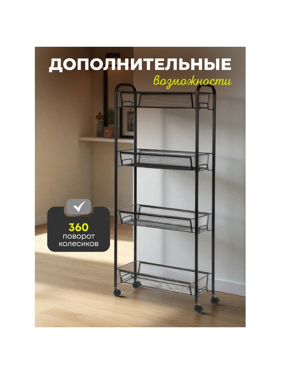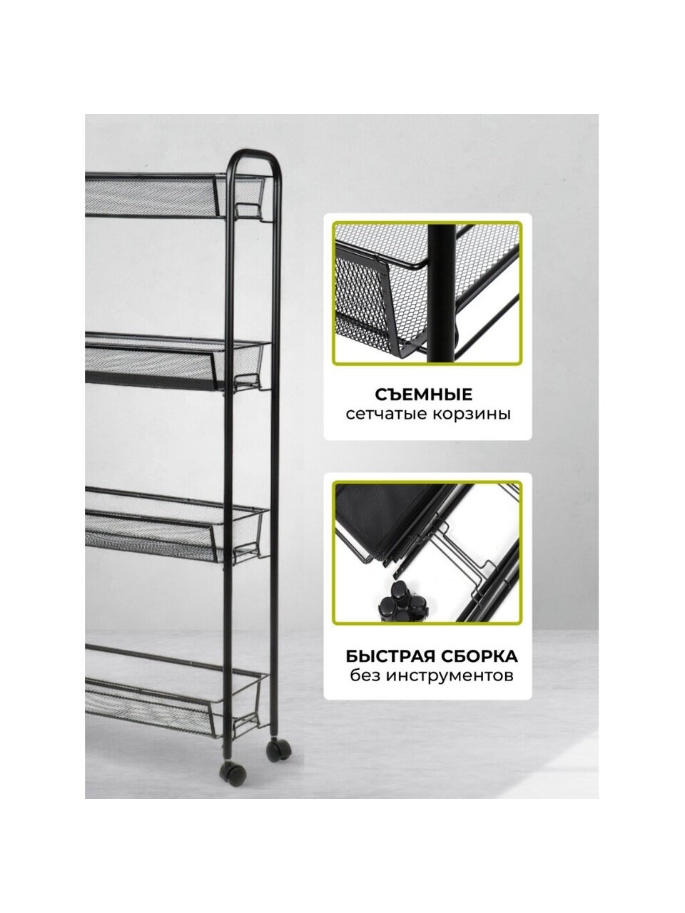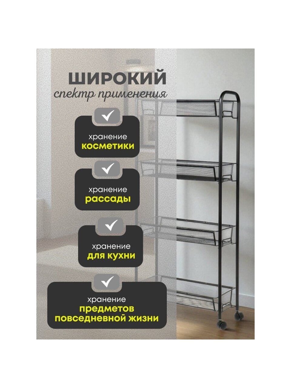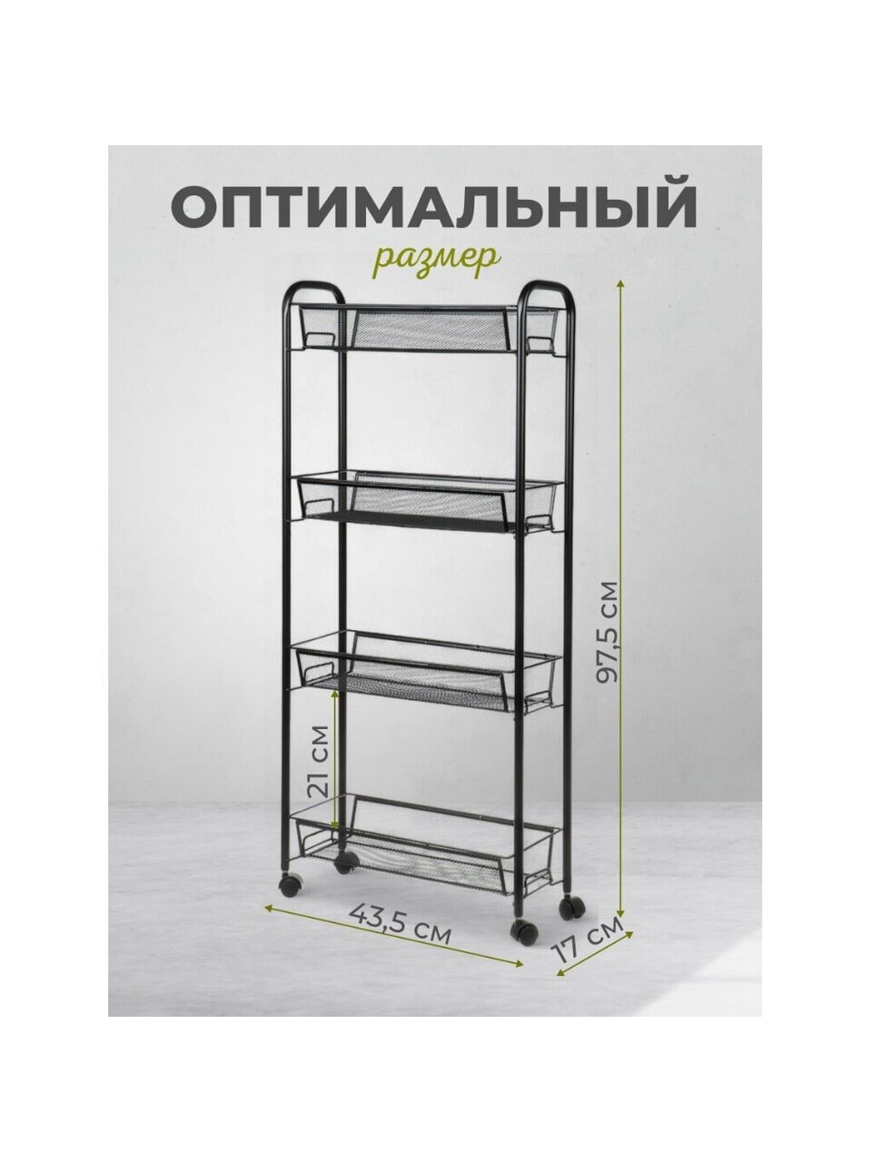 Универсальная этажерка из стали с четырьмя секциями — это идеальное решение для компактного и стильного хранения. Благодаря своим габаритам 43.5х17х97.5 см и элегантному черному цвету, она прекрасно впишется в любой интерьер, добавляя современный штрих. Эта этажерка на колесах с мелкосетчатыми корзинами станет незаменимой помощницей в организации пространства, будь то кухня, ванная комната или офис. Расстояние между полками 21 см.