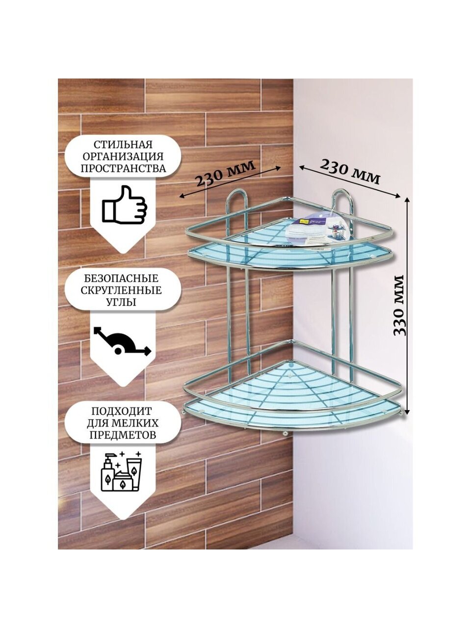 Полка оснащена двумя вместительными ярусами, которые позволяют удобно разместить все необходимые предметы для гигиены, косметику, шампуни и бытовую химию. Стальная основа обеспечивает надежность и устойчивость к влаге, что особенно важно для помещений с повышенной влажностью. Размер 33х23 см оптимален для хранения различных аксессуаров, не занимая лишнего пространства. Хромированный цвет придает полке современный и ухоженный вид, который легко сочетается с сантехникой и аксессуарами в ванной комнате.