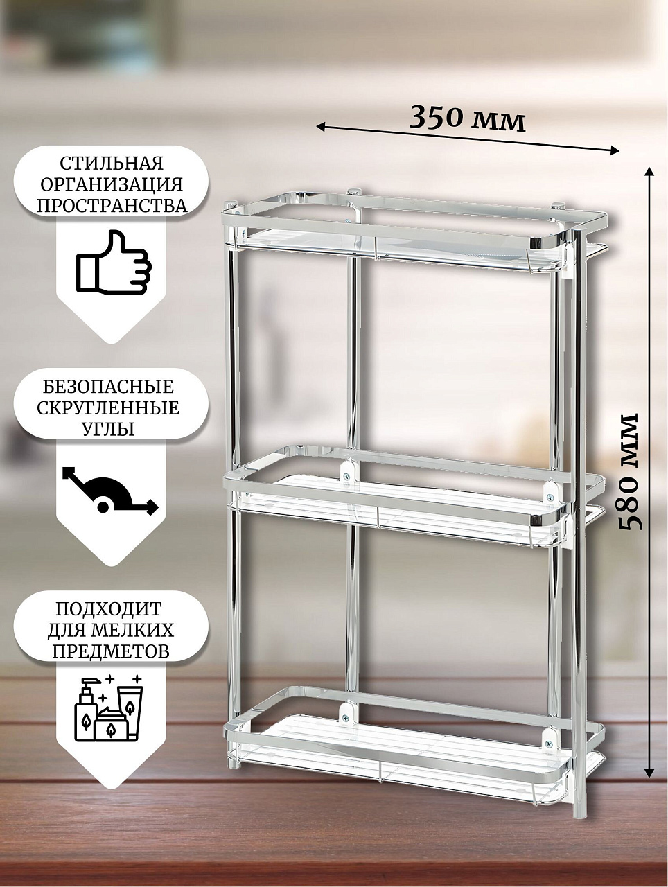Полка выполнена из прочного металла, что гарантирует долговечность и надежность эксплуатации. Хромированное покрытие не только защищает стальное основание от влаги, но и придает блеск, подчеркивая эстетику интерьера. Благодаря продуманной конструкции обеспечивается рациональное распределение предметов, что помогает поддерживать порядок и чистоту без лишних усилий. Три яруса позволяют легко организовать хранение всех необходимых вещей, избавляя от беспорядка и экономя время на поиски нужного предмета.