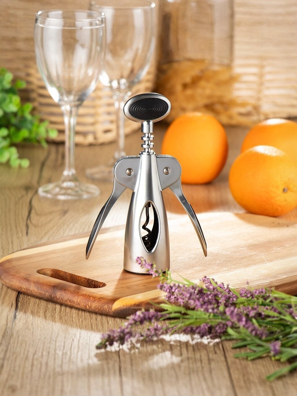 Штопор позволяет извлекать пробки из бутылок в несколько простых действий. Благодаря конструкции с двумя рычагами и винтовым механизмом, процесс извлечения пробки не занимает много времени.