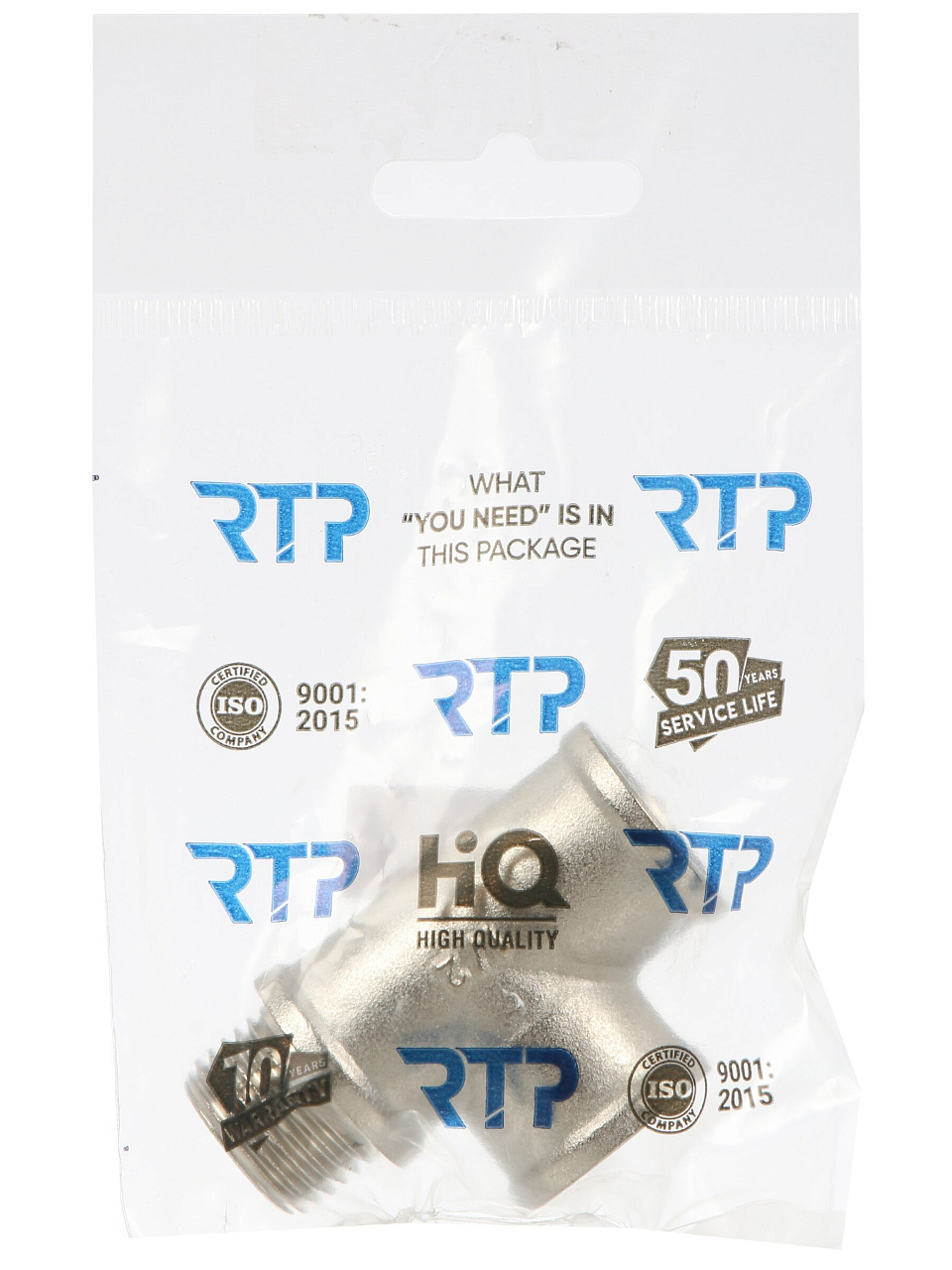 Размер подключения — 1/2 дюйма, тип присоединения — г-г-ш (две внутренние резьбы, одна наружная), универсален для большинства бытовых и промышленных труб.