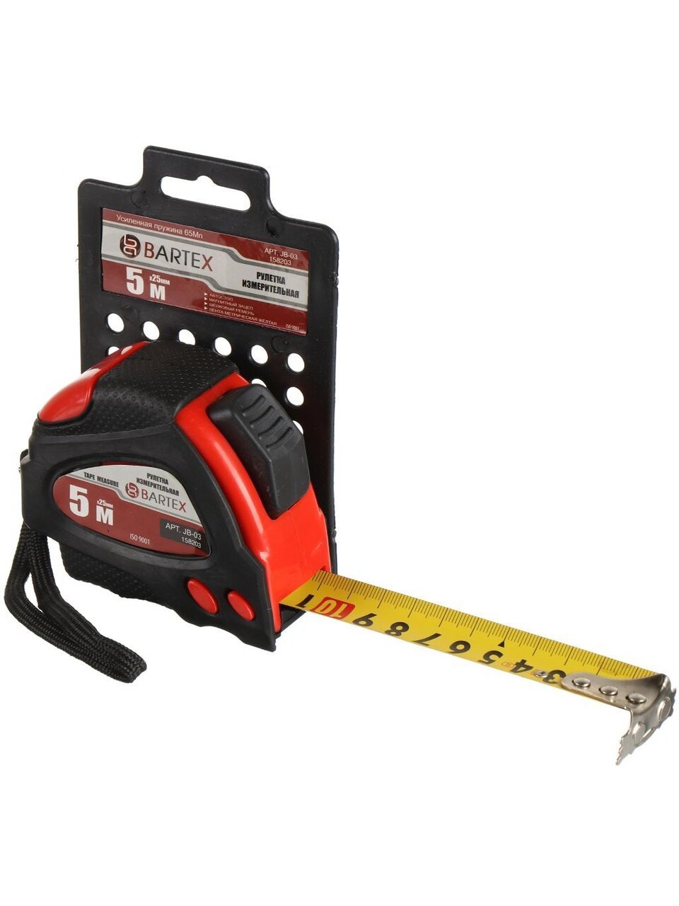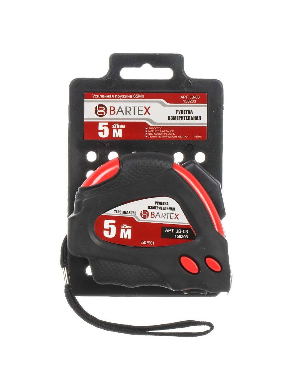 Рулетка измерительная Bartex JB-01 имеет обрезиненный корпус из прочного пластика, устойчивого к нагрузкам, в том числе к падениям. Лента имеет удобный магнитный ограничитель, который можно фиксировать на металлических поверхностях. Края ленты специально обточены во избежание случайных порезов при использовании.
