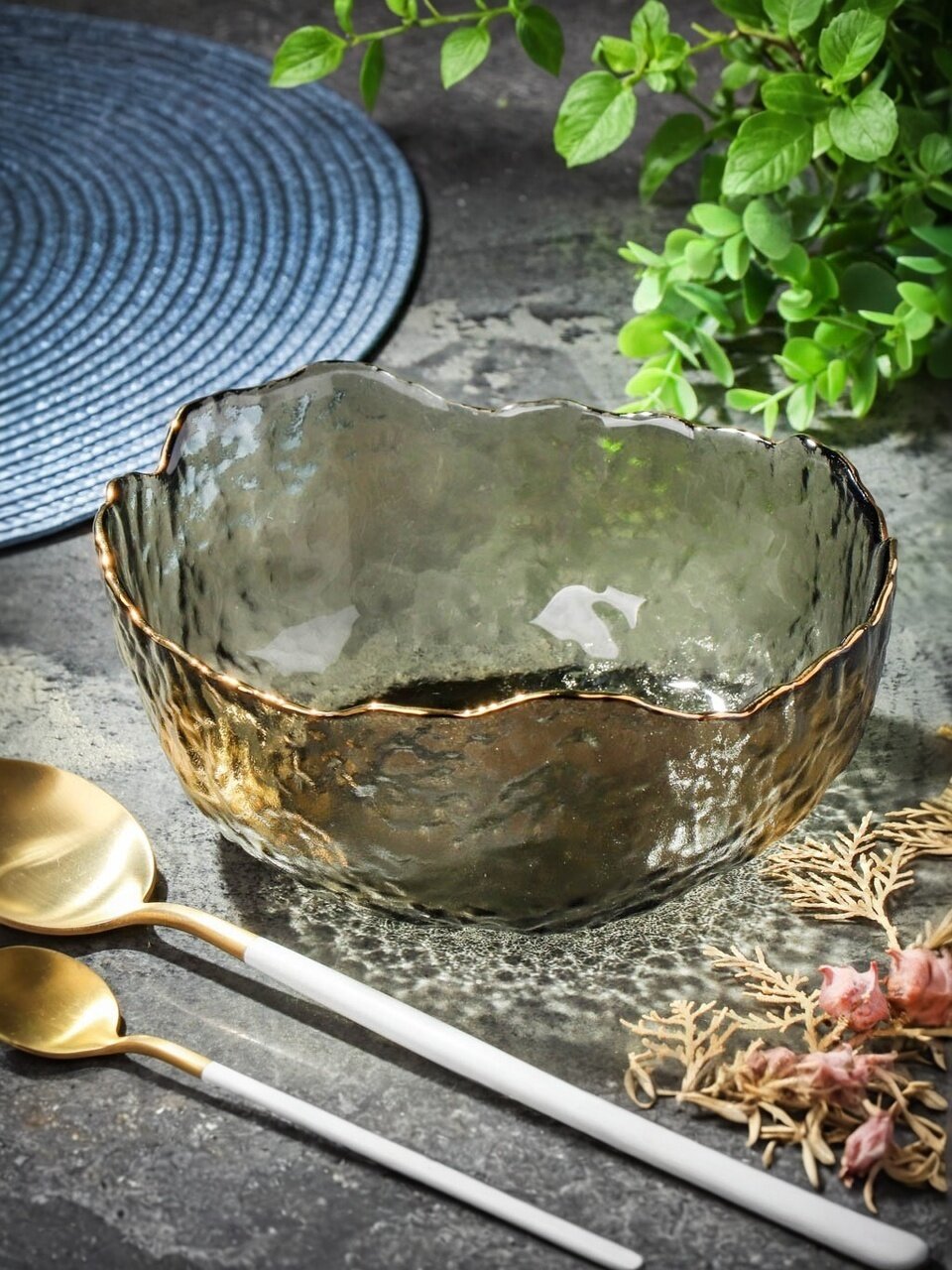 Салатник из графитового стекла 16×7 см с золотым обводом: эффектный акцент для сервировки, который подчеркнёт стиль и прочность — идеален для дома и подарка.