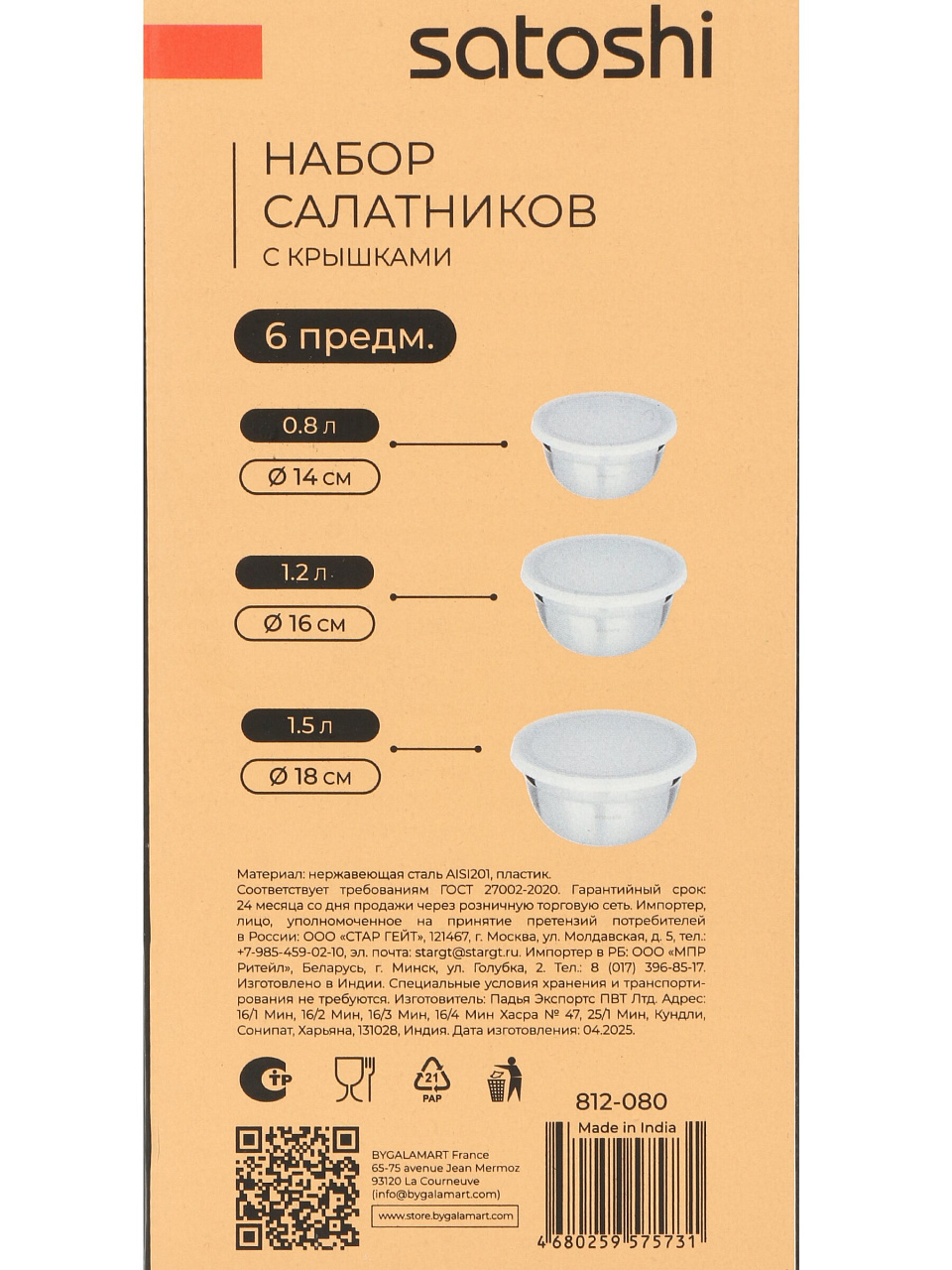 Вы можете приобрести «Салатник сталь, круглый, 3 шт, 14, 16, 18 см, 0.8, 1.2, 1.5 л, с крышкой, Satoshi, 812-080» и другие товары в нашем интернет-магазине в Липецке по низким ценам и с бесплатным самовывозом.