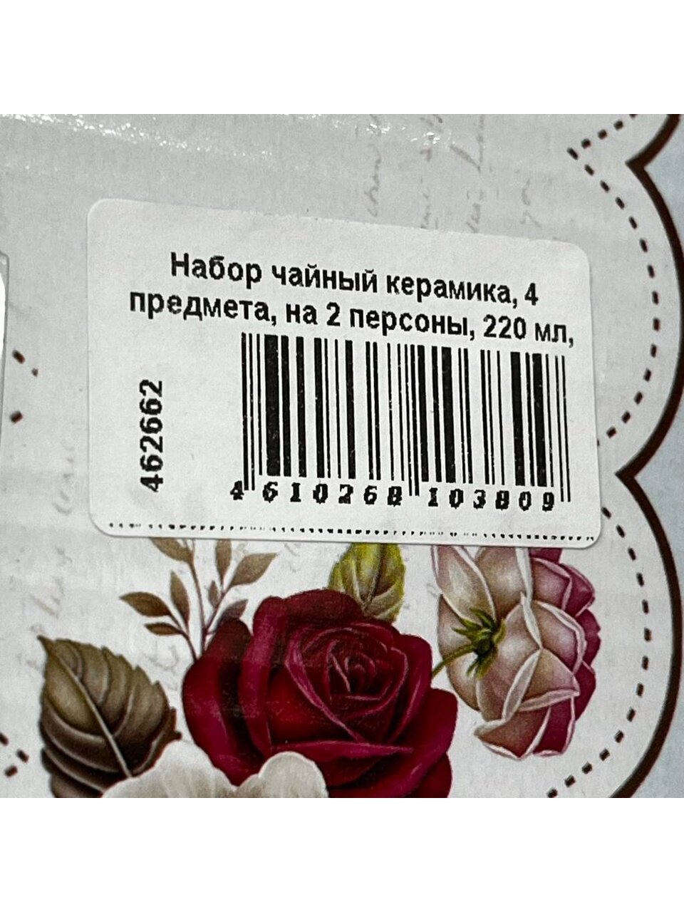 В комплекте 4 предмета на 2 персоны: 2 чашки объёмом 220 мл и 2 блюдца. Все детали выполнены из прочной керамики с рисунком.
