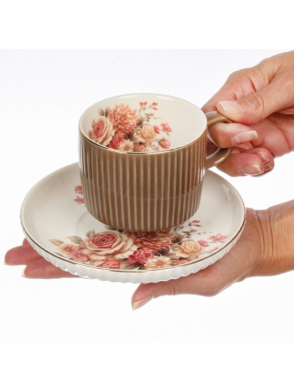Чайный набор на 6 персон «Чайная роза» — 12 предметов из керамики с золотой отводкой: стильный подарок, уют для дома и дачи, идеальный объём чашки 230 мл.