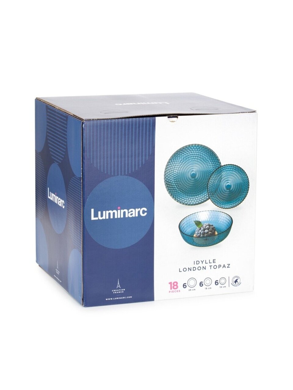 Сервиз столовый стекло Luminarc Idylle London Topaz Q4077 — 18 предметов для 6 персон: стильный синий дизайн, прочное стекло, подходит для посудомоечной машины и СВЧ. Идеально для подарка или вашего дома.