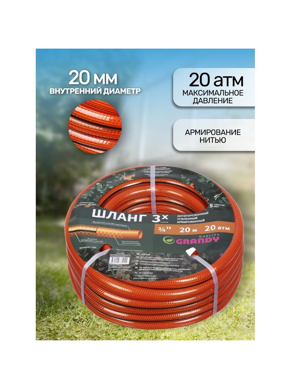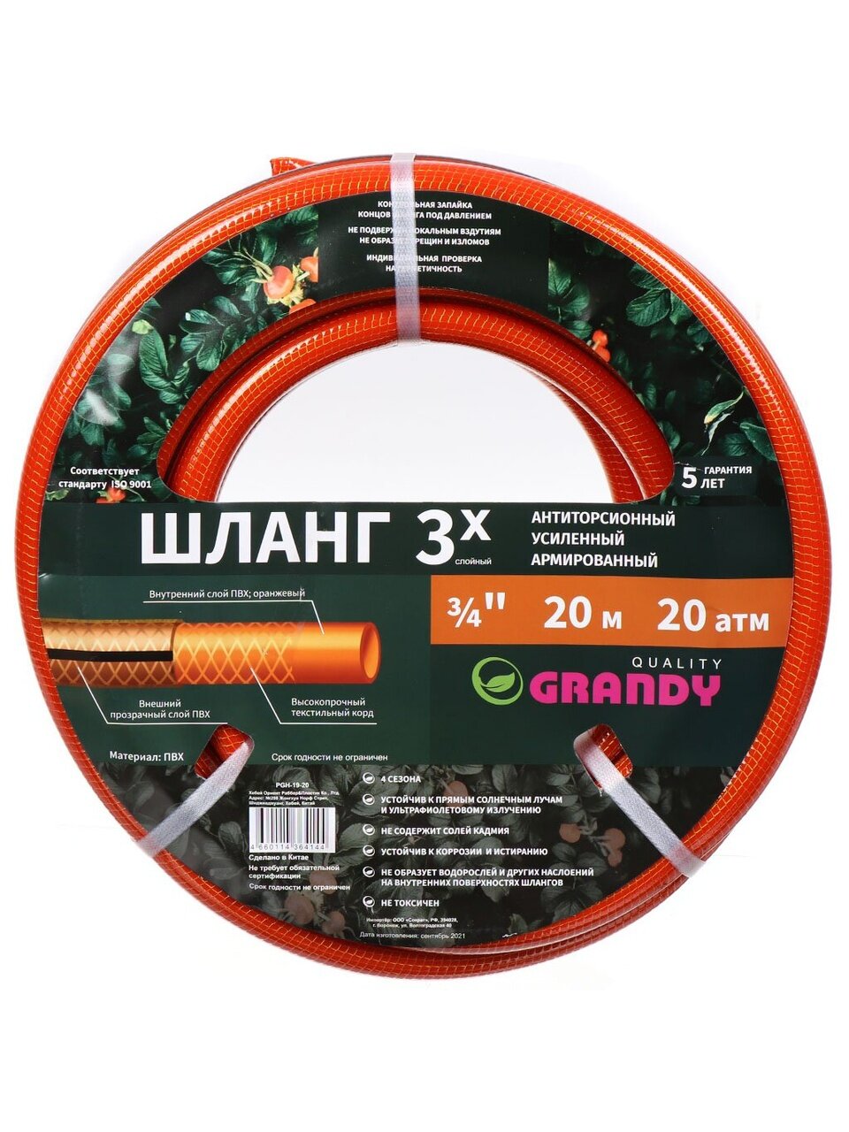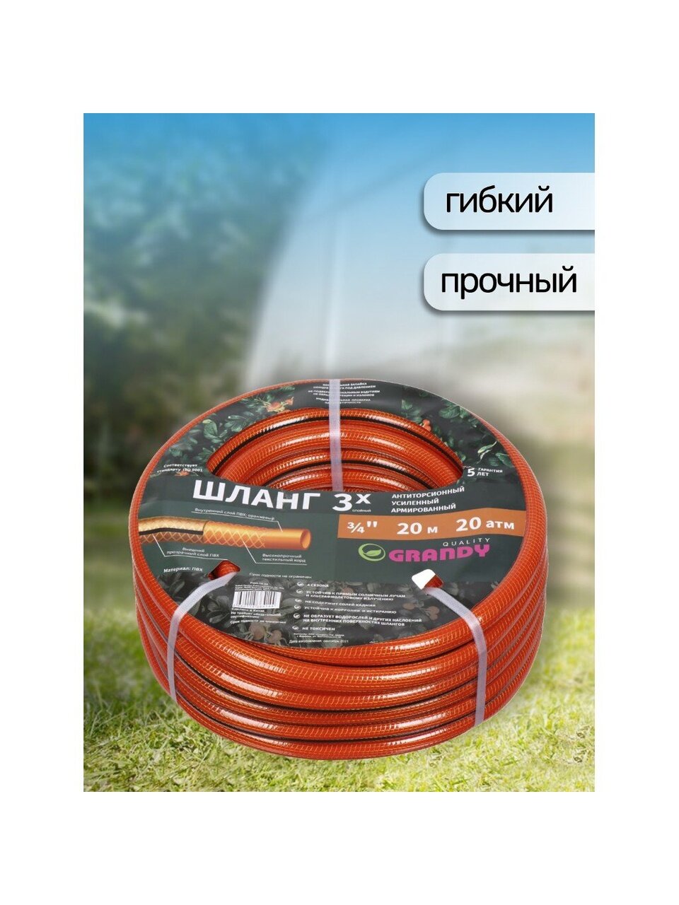 Шланг Grandy используется для поливочных работ на садово-огородных участках. Трехслойный. Он выполнен из высококачественного первичного ПВХ, что делает его прочным и долговечным. Благодаря армированию прочной полиэсторовой нитью, шланг устойчив к механическому воздействию и перегибам.