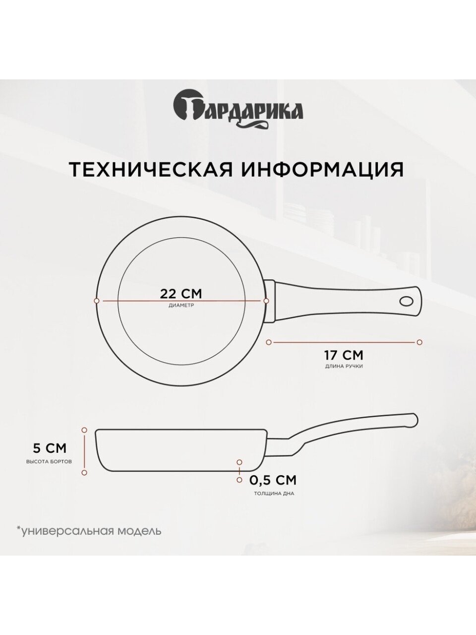 - Универсальный диаметр 22 см — удобно для приготовления завтраков, обедов и ужинов, отличный подарок