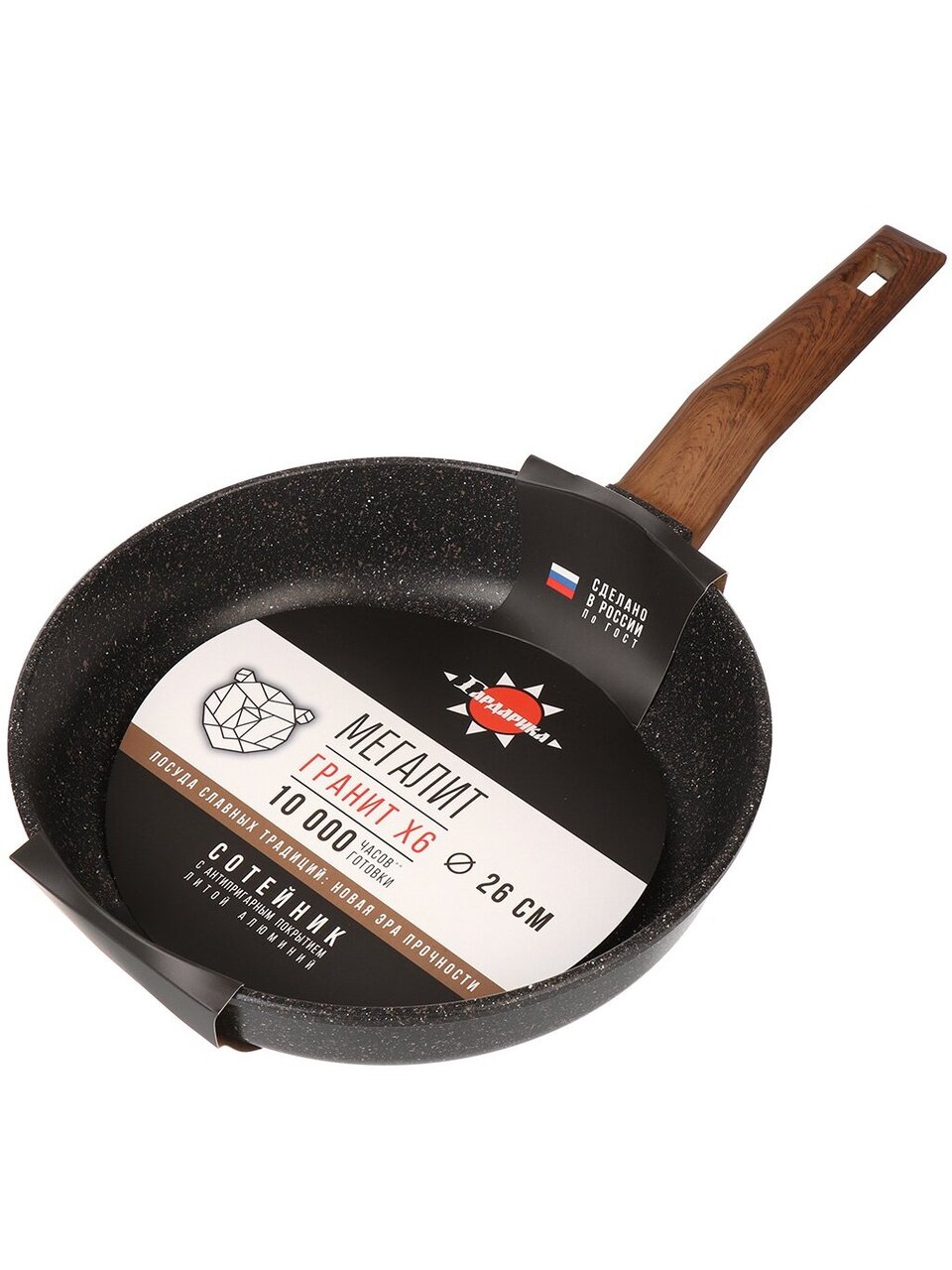 Сковорода литой алюминий 26 см Гардарика Мегалит 18: антипригарное гранитное покрытие, soft-touch ручка — идеально для приготовления без масла и пригорания.