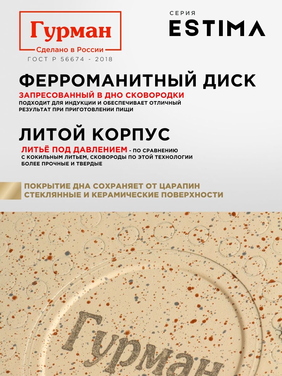 Сковорода поставляется в подарочной коробке и комплектуется крышкой, что делает ее отличным выбором для подарка на новоселье или для использования на даче. Высокие борта (65 мм) позволяют готовить блюда с соусом и жарить крупные куски мяса. Можно мыть в посудомоечной машине, что экономит ваше время. Модель Гурман Estima подходит для газовых, электрических, стеклокерамических и индукционных плит, что особенно удобно при смене места проживания или переезде на дачу.