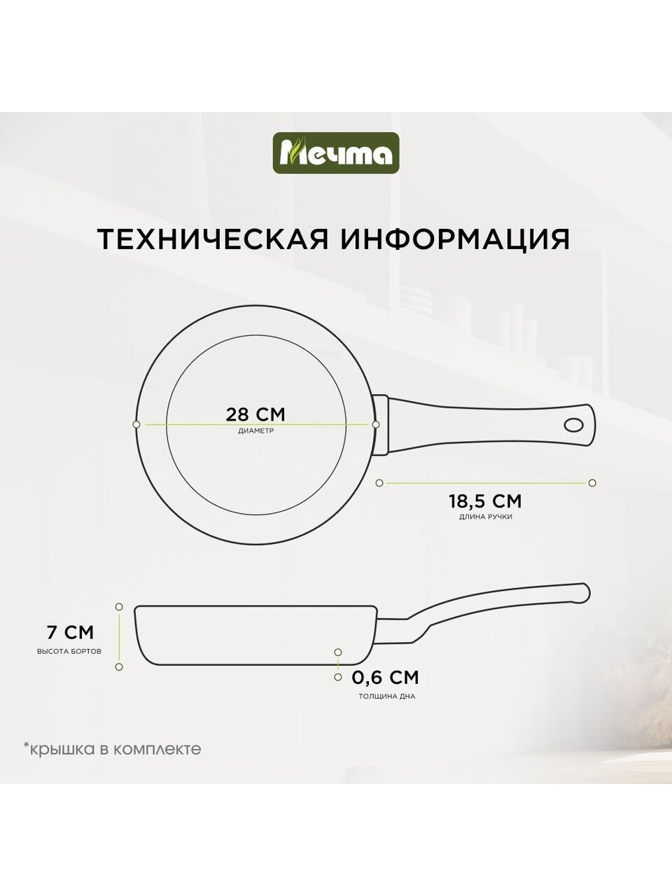 - Толстое дно 6 мм и литой алюминий — равномерный нагрев, долговечность, диаметр 28 см для семьи