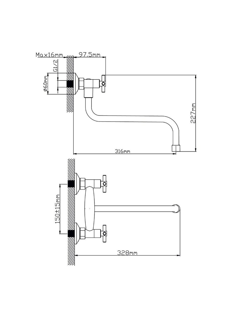 Высота излива — 22,7 см, длина — 31,6 см, межосевое расстояние для монтажа — 150 мм, крепление на 2 отверстия с гибкой подводкой 1/2".