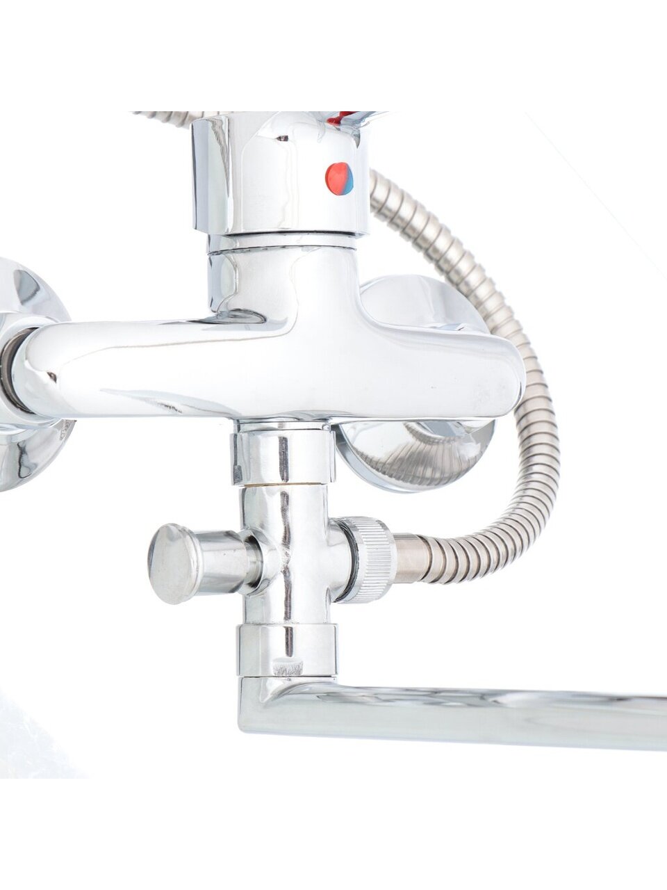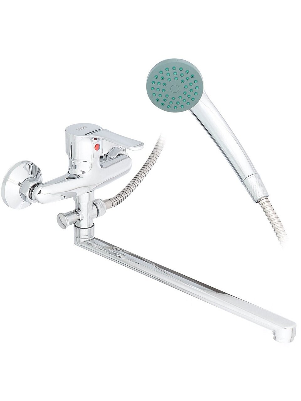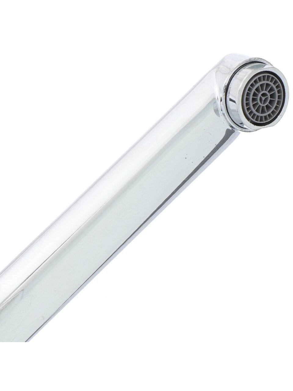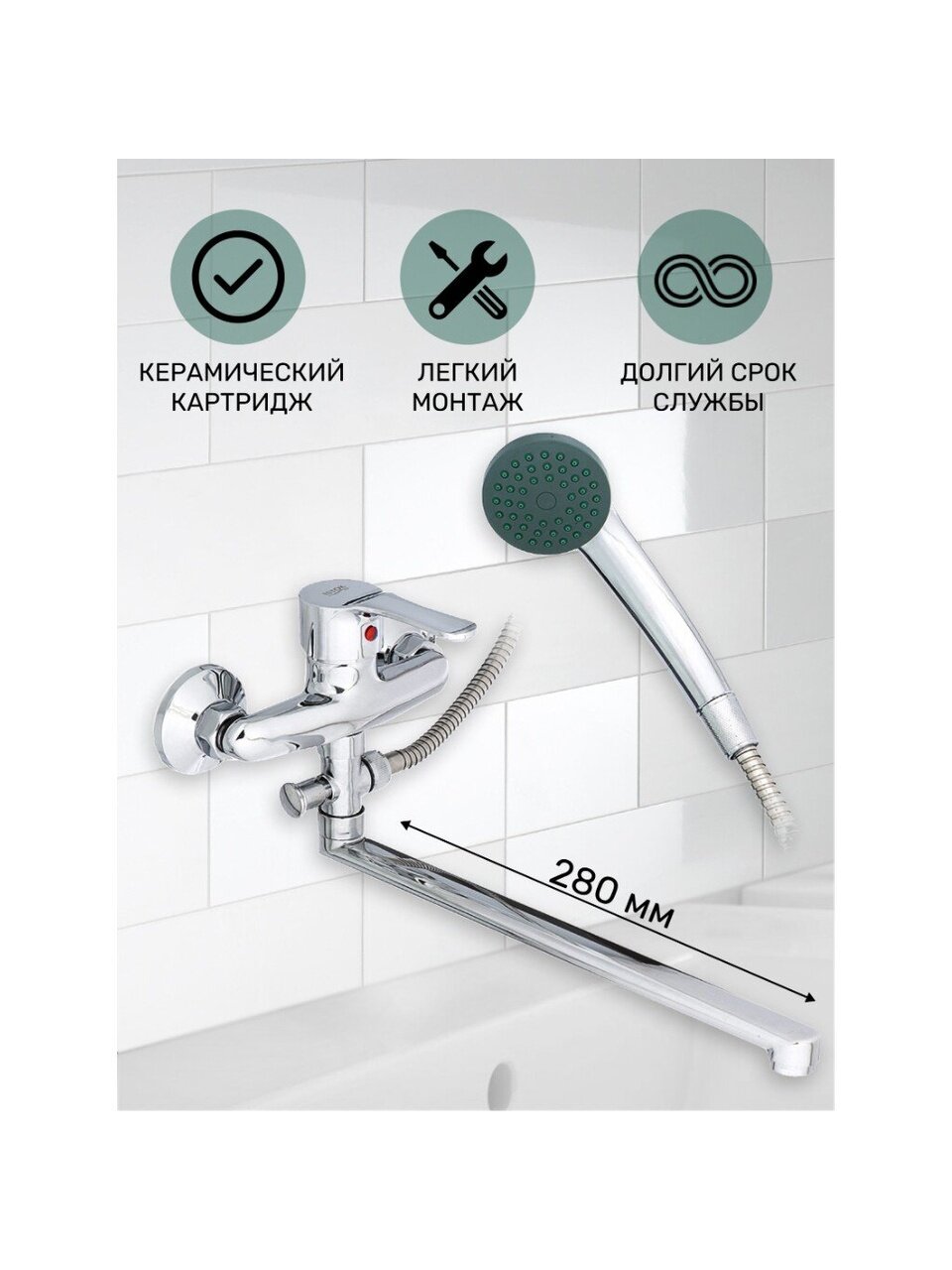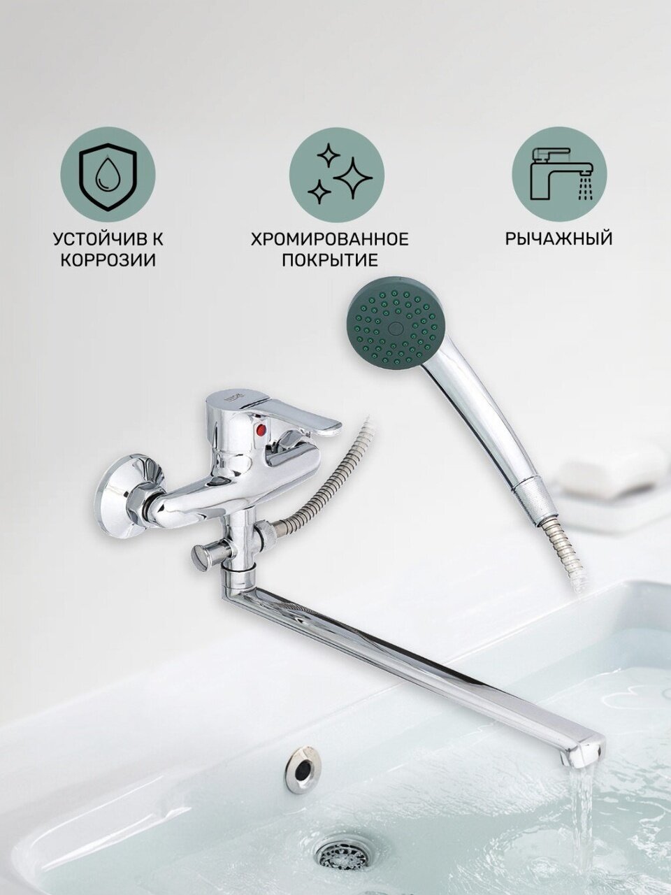 - Корпус из латуни с глянцевым хромированием, длинный поворотный излив 28 см — удобно для ванны и душа