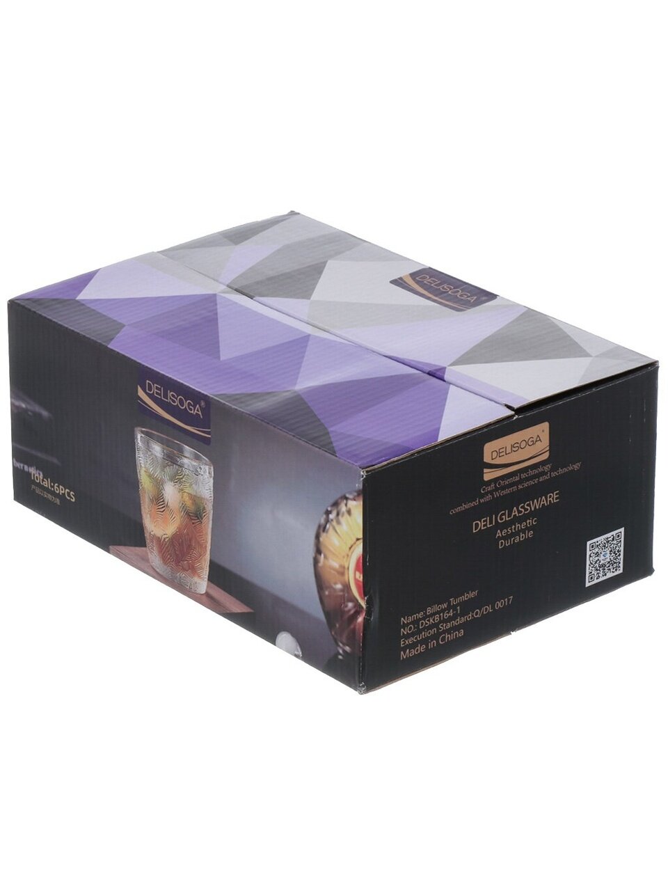 Объём каждого стакана — 300 мл, форма — высокий и широкий рокс, материал — прозрачное стекло. В наборе 6 штук.