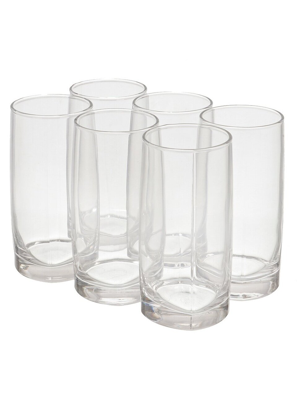В комплекте — 6 высоких стаканов из прозрачного стекла, каждый объёмом 309 мл. Высокая форма и современный стиль делают их удачным выбором для сервировки и подарка.