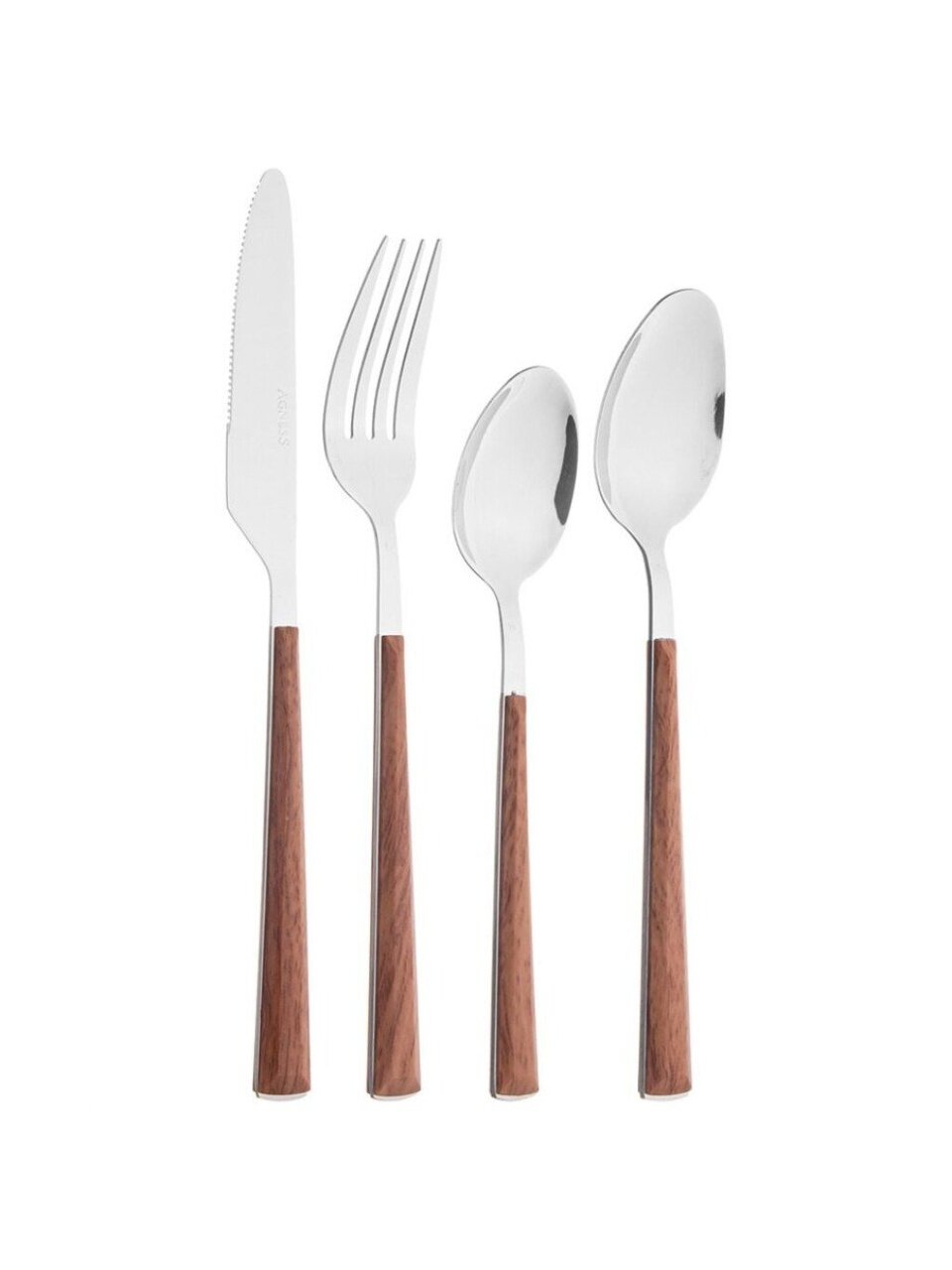 В наборе 16 предметов из нержавеющей стали: столовые ложки, вилки, ножи и чайные ложки с коричневыми ручками из металла и пластика, без покрытия.