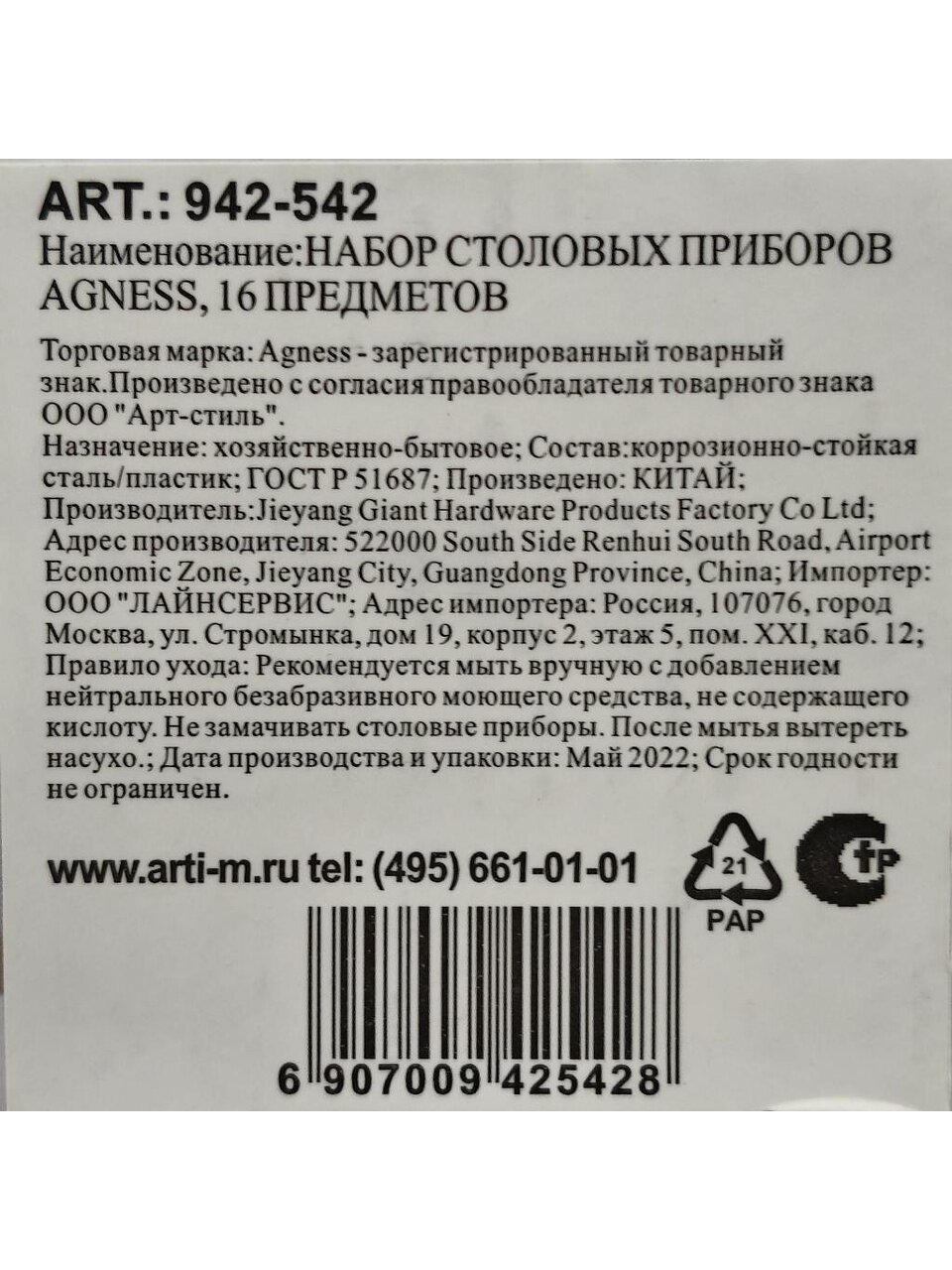 Закажите набор столовых приборов Agness 942-542 по выгодной цене — стильная сервировка, долговечность и презентабельность в одном комплекте. Быстрая доставка и гарантия качества от проверенного бренда.