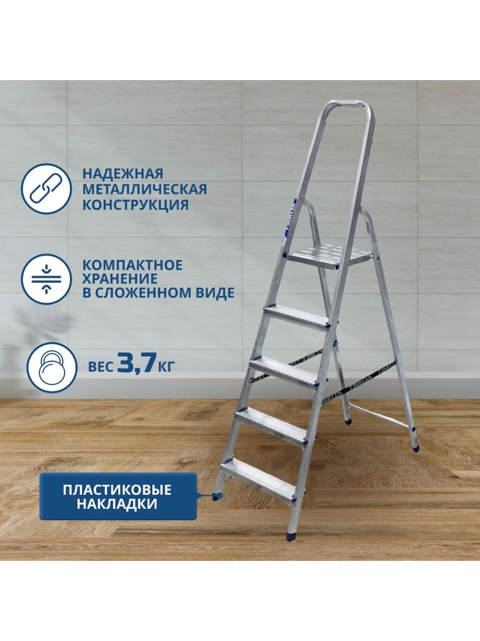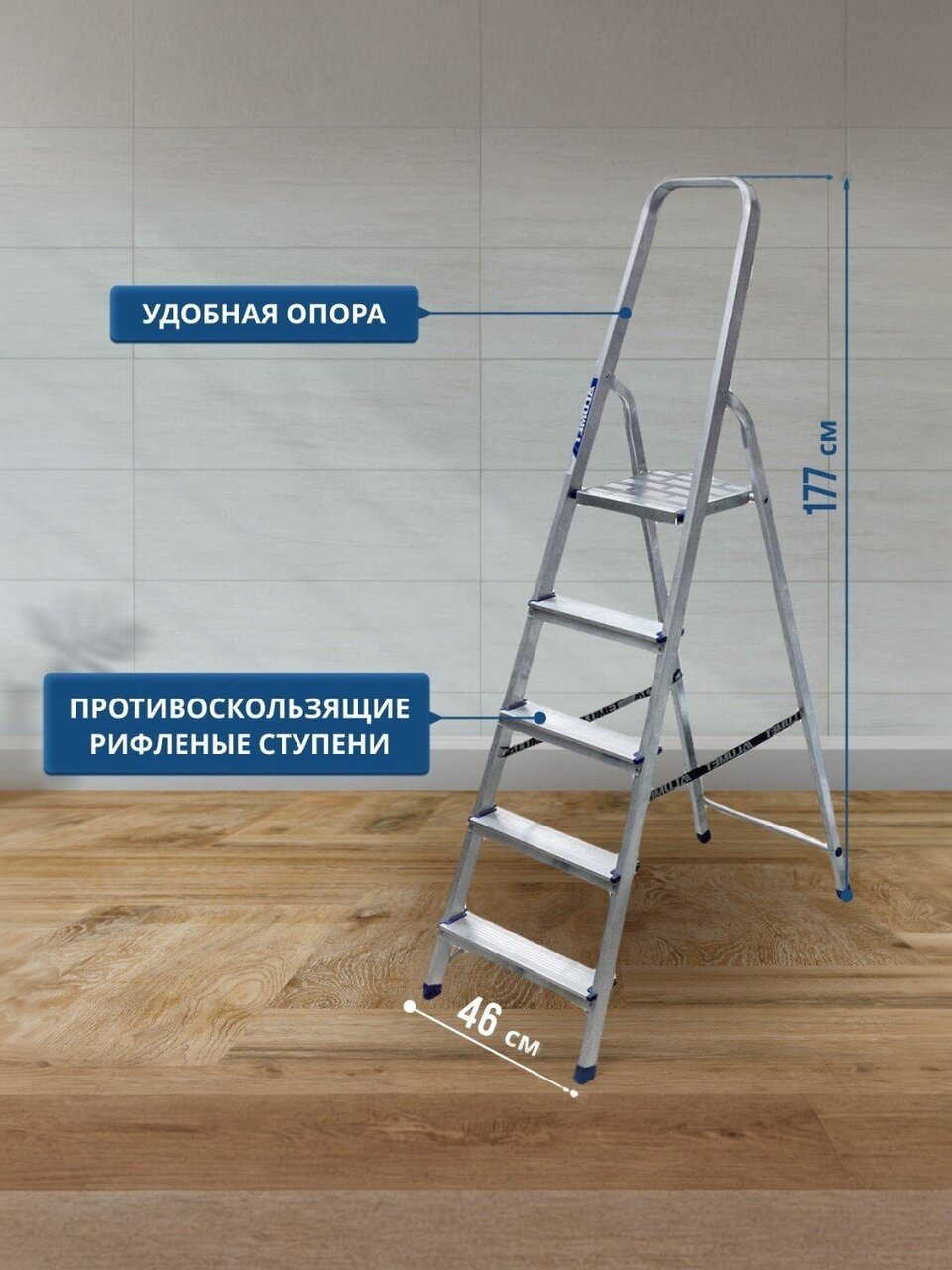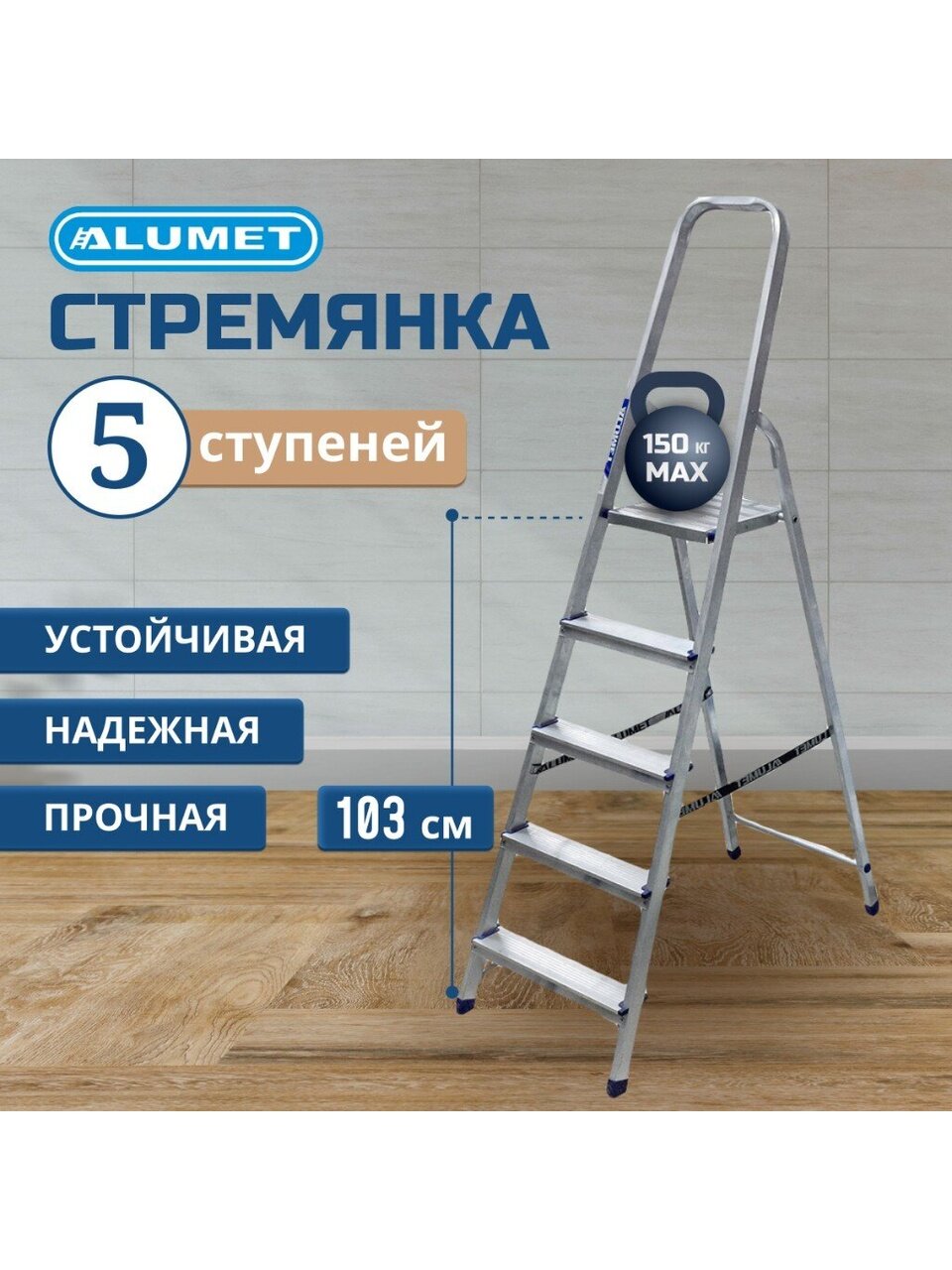Вы можете приобрести «Стремянка 1 секция, 5 ступеней, алюминий, 1.03 м, 150 кг, рифленые ступени, Alumet, AM705» и другие товары в нашем интернет-магазине в Орле по низким ценам и с бесплатным самовывозом.