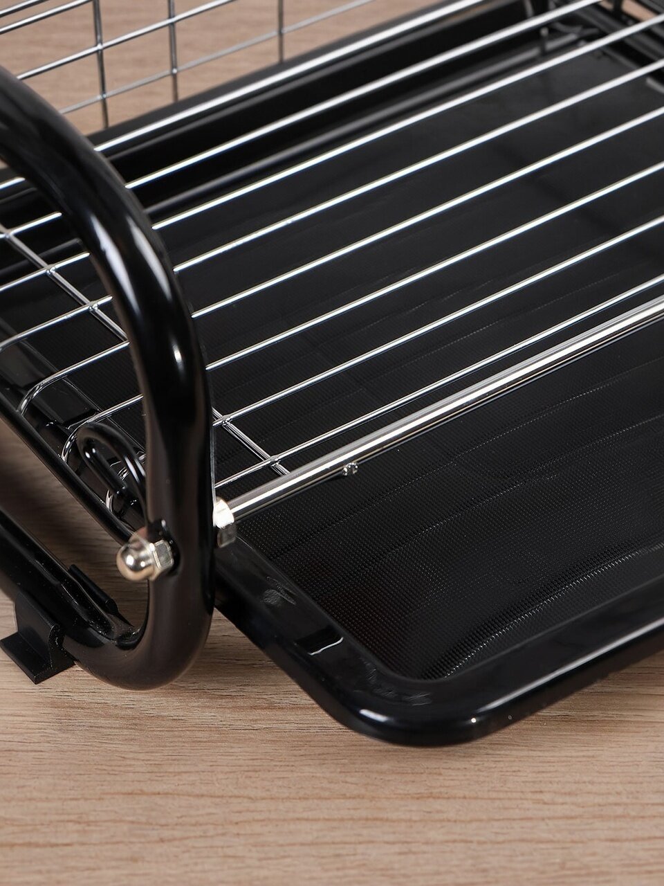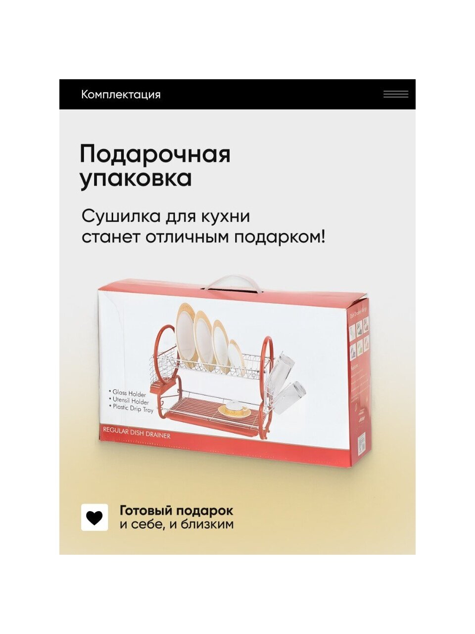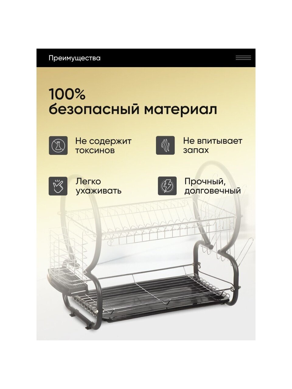 Сушилка для посуды - это помощница, которая нужна на кухне каждый день. Двухуровневая конструкция состоит из устойчивого основания, верхней решетки для тарелок и блюдец, а также предусмотрено место для сушки столовых приборов и кружек. Поддон можно использовать отдельно как лоток для сушки столовых принадлежностей, приборов, овощей или фруктов. Посудосушитель можно удобно расположить рядом с мойкой или раковиной на силиконовом коврике. Так же будет отлично смотреться на столе, стеллаже, в шкафу.