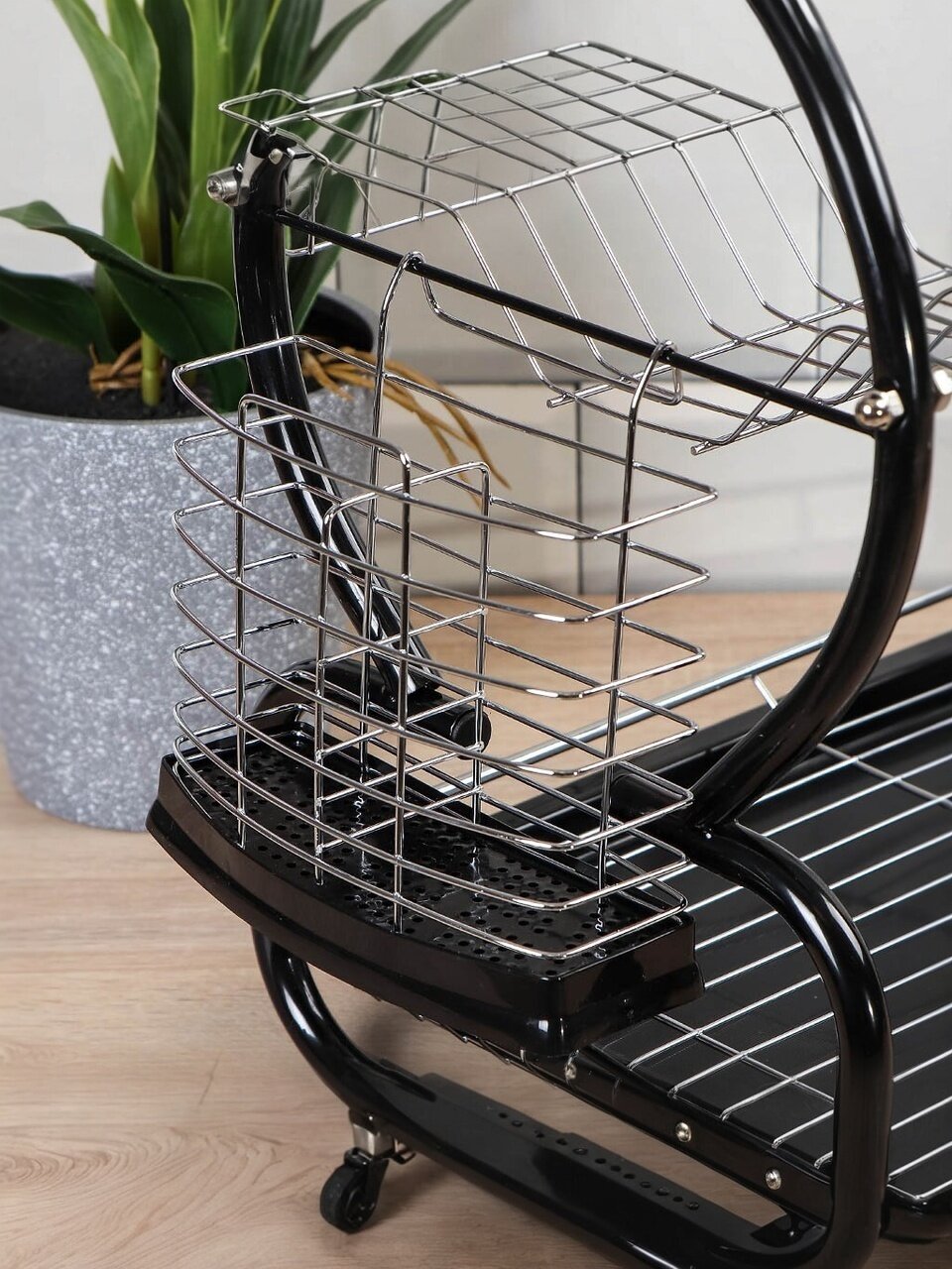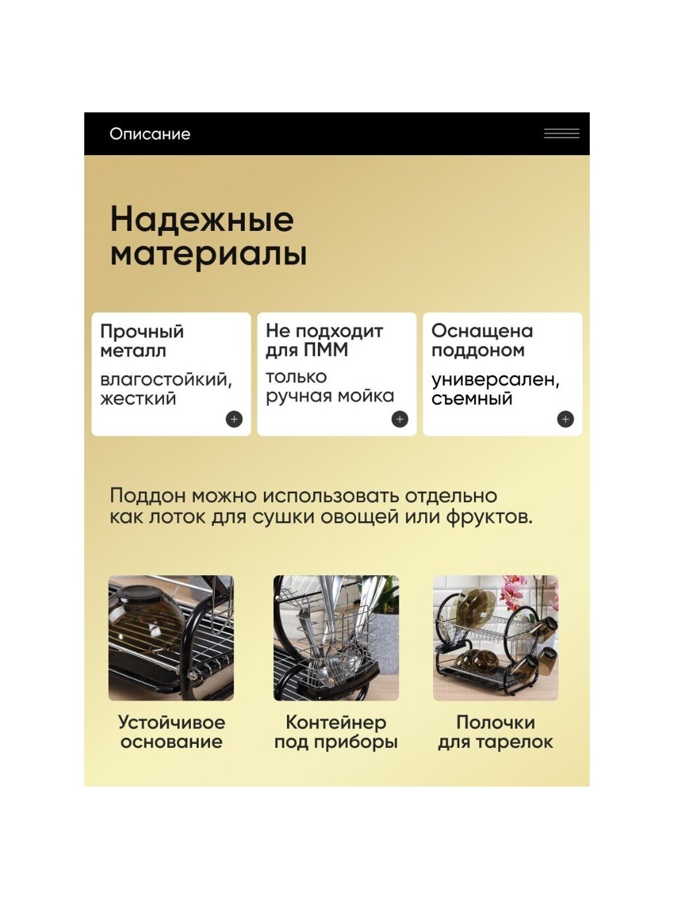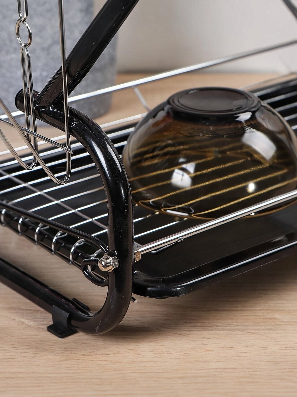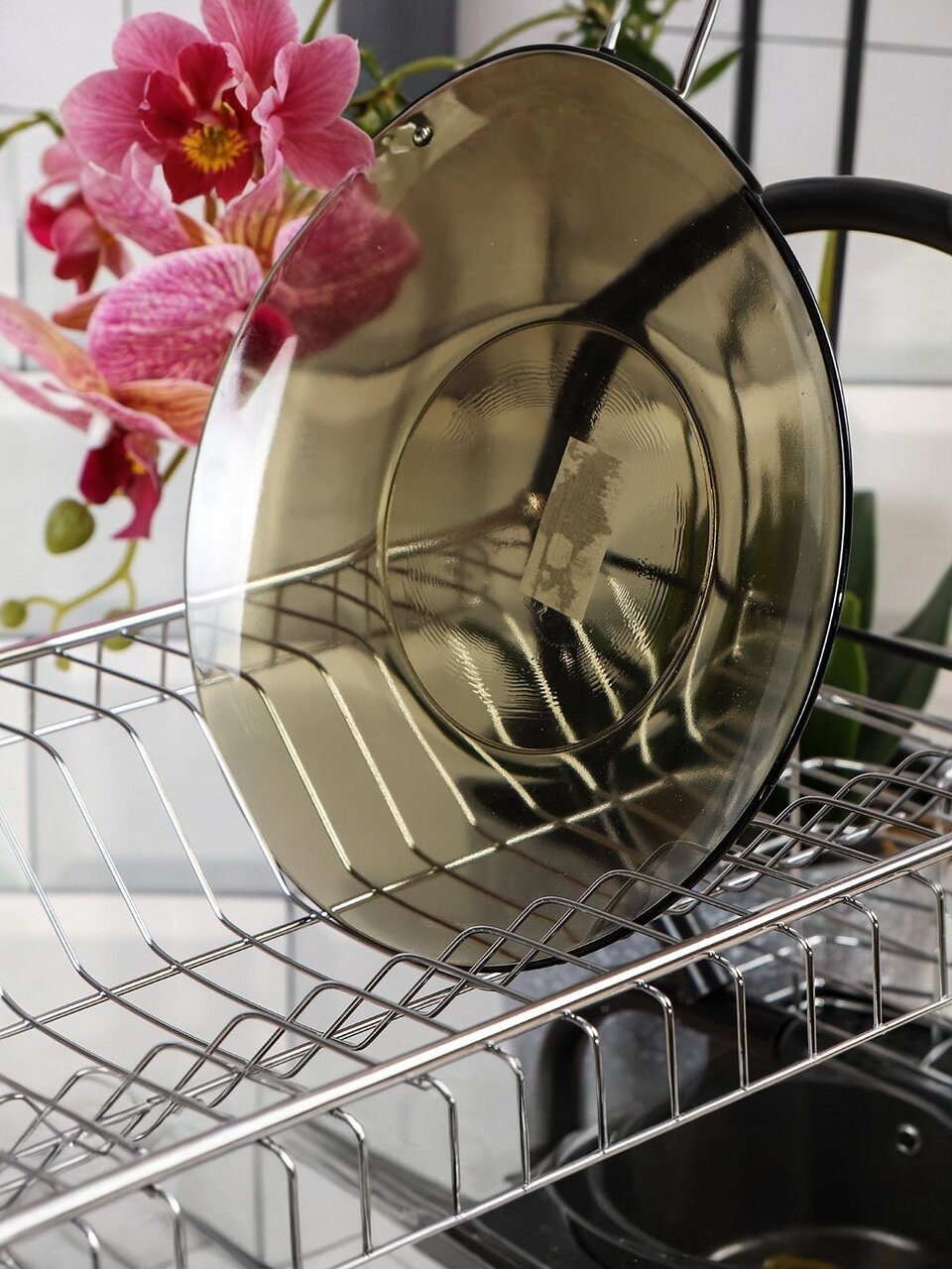 Сушилка для посуды - это помощница, которая нужна на кухне каждый день. Двухуровневая конструкция состоит из устойчивого основания, верхней решетки для тарелок и блюдец, а также предусмотрено место для сушки столовых приборов и кружек. Поддон можно использовать отдельно как лоток для сушки столовых принадлежностей, приборов, овощей или фруктов. Посудосушитель можно удобно расположить рядом с мойкой или раковиной на силиконовом коврике. Так же будет отлично смотреться на столе, стеллаже, в шкафу.