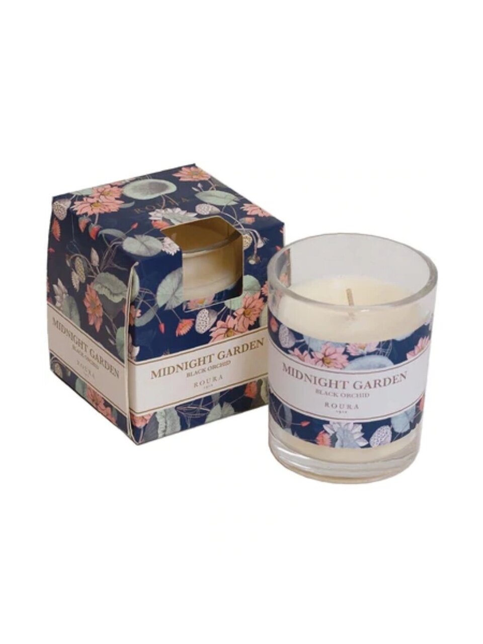Свеча ароматизированная Roura «Полуночный сад» 8.5×7 см — элегантный подарок и уютная атмосфера для дома: насыщенный цветочный аромат, стильный синий стакан, премиальный кокосовый воск.