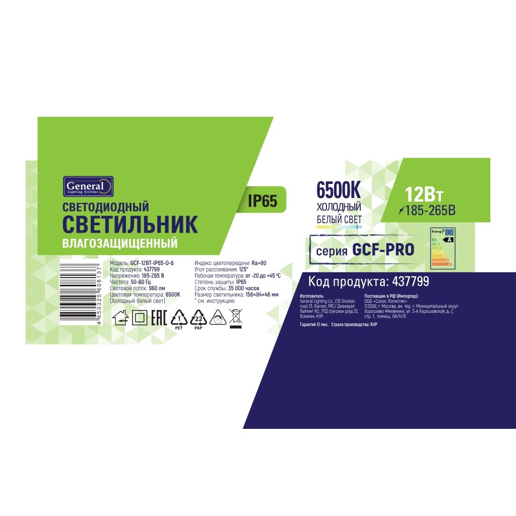 Вы можете приобрести «Светильник светодиодный General Lighting Systems, ЖКХ, 12 Вт, 6500 К, 960 Лм, IP65, 15.8х8.4х4.6 см, холодный белый свет, GCF-12BT-IP65-O-6» и другие товары в нашем интернет-магазине в Брянске по низким ценам и с бесплатным самовывозом.