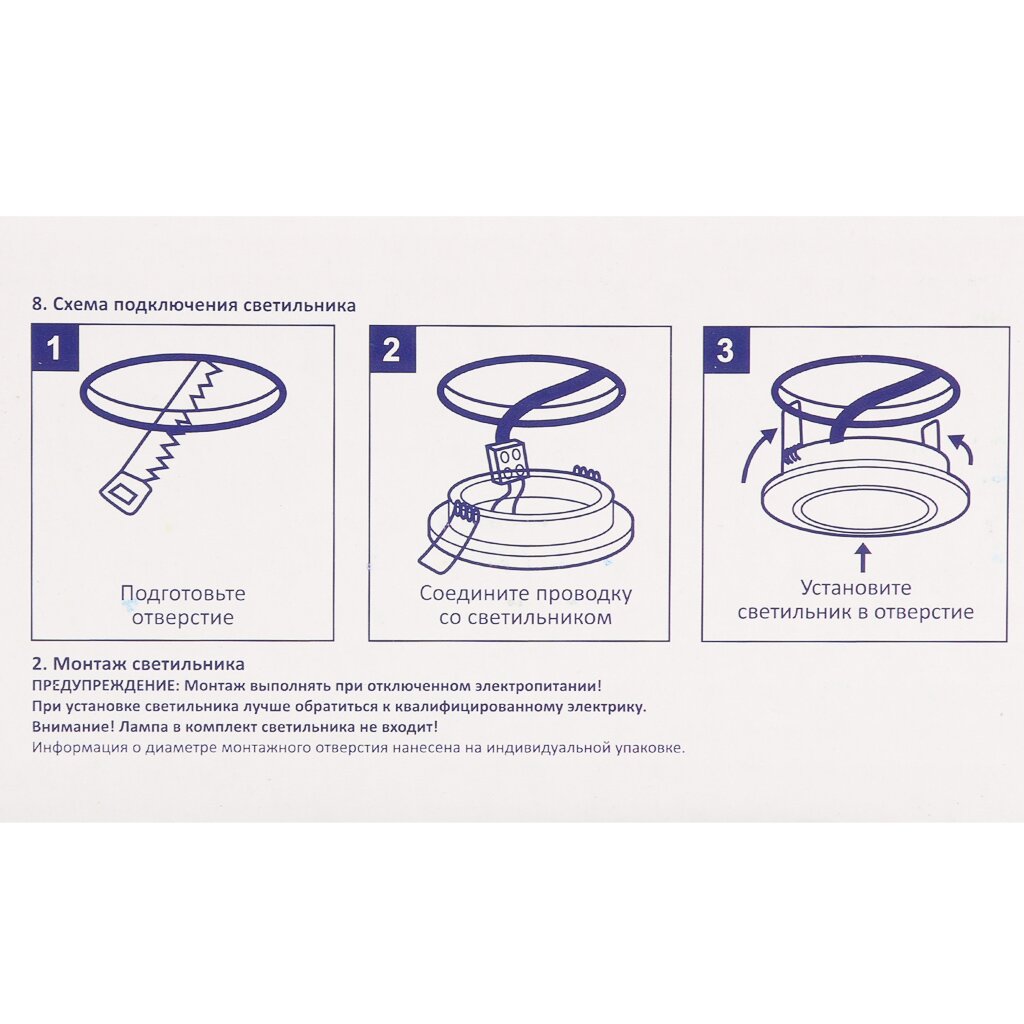 Для монтажа потребуется отверстие диаметром 90 мм, высота светильника — 6 см. Установка проста даже для новичков.