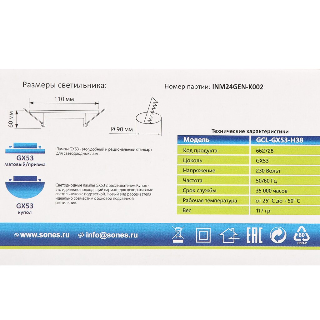 Светильник рассчитан на лампы с цоколем GX53, работает от сети 230 В, степень защиты IP20 — для сухих помещений.
