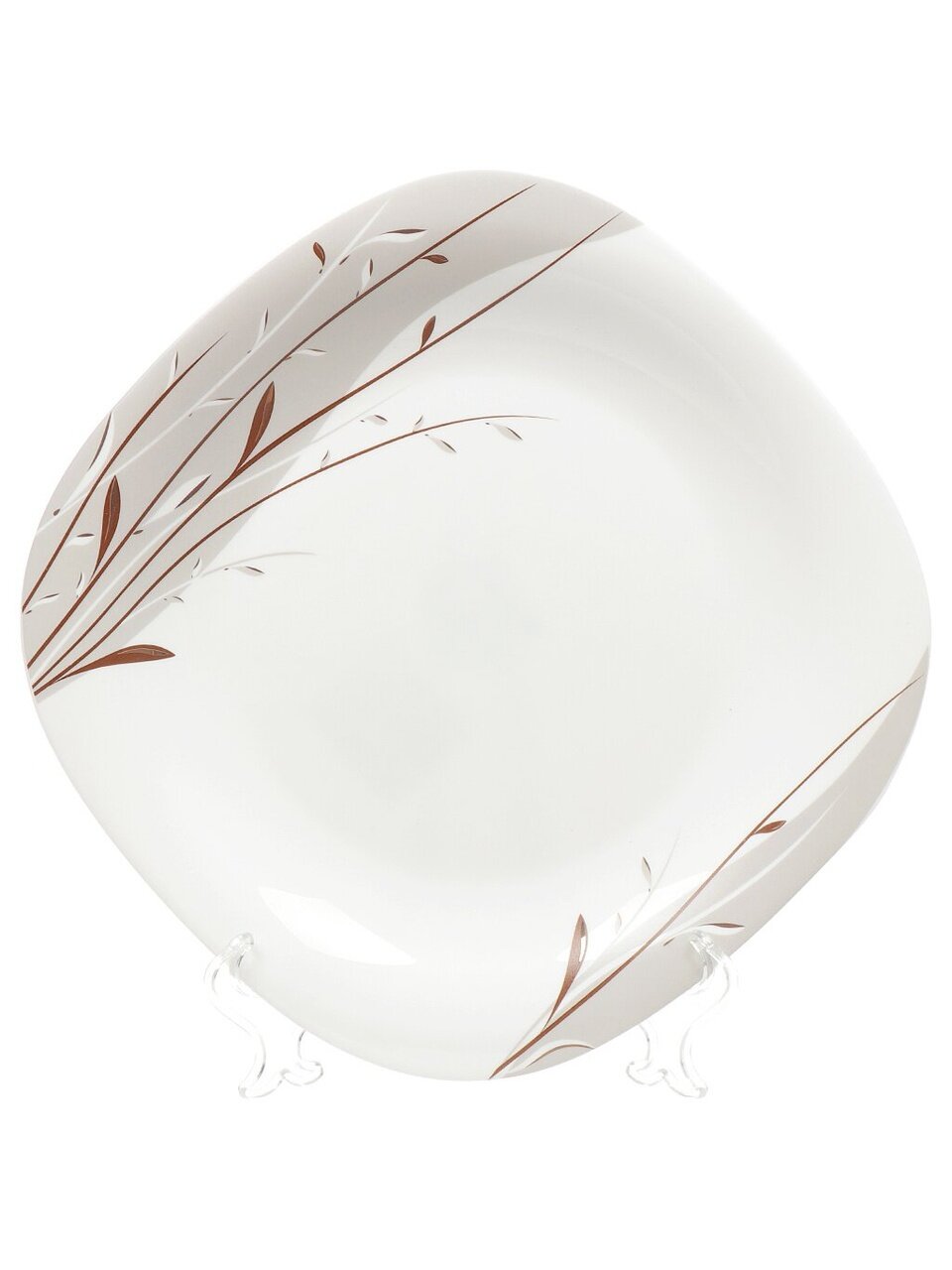 Диаметр 26 см, квадратная форма. Белая основа с растительным орнаментом, подходит для сервировки и ежедневного использования.