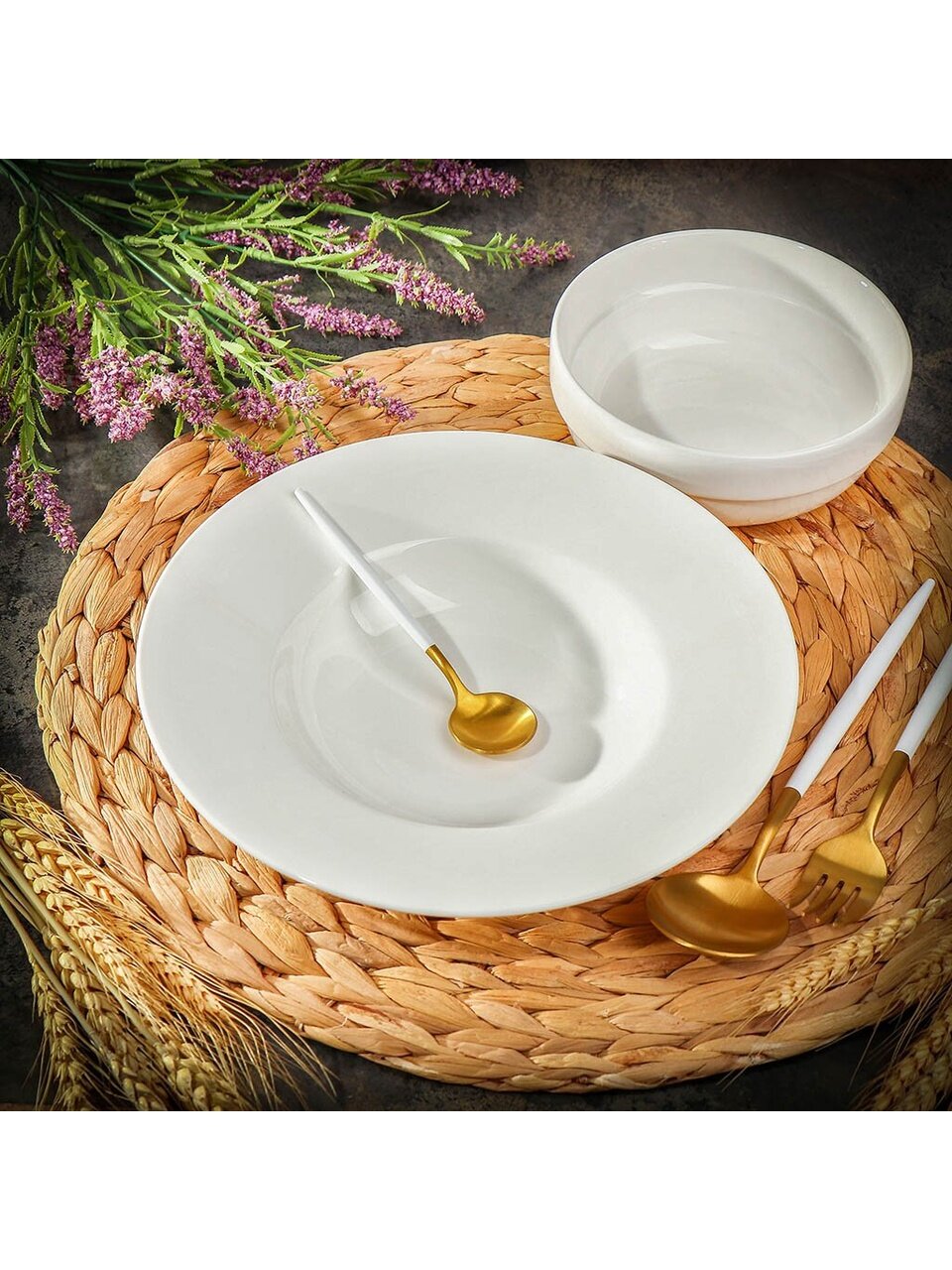 Тарелка суповая Daniks Грейс диаметром 23 см выполнена из прочной керамики, что обеспечивает долгий срок службы и устойчивость к сколам. Белая круглая форма без декоративных элементов делает её универсальным выбором для ежедневного использования и праздничной сервировки. Часто спрашивают, какая тарелка лучше для супа и пасты — глубокая модель Daniks Грейс оптимальна по объёму, легко помещается в стандартные посудомоечные машины и микроволновки.