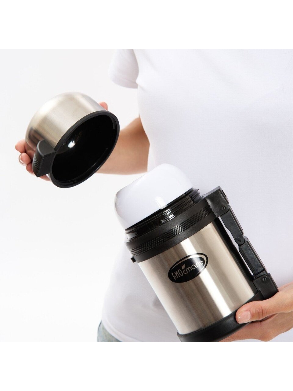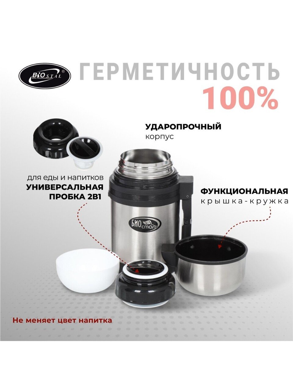 В отличие от аналогов с пластиковыми вставками, Biostal выполнен полностью из нержавеющей стали — это гарантирует отсутствие посторонних запахов и простоту ухода. Если вы ищете, какой термос для еды купить недорого для дачи или города, обратите внимание на универсальность: подходит для взрослых, студентов, офисных работников. Крышка-термос с навинчивающимся механизмом исключает протекания, а серебристый дизайн с рисунком добавляет индивидуальности.