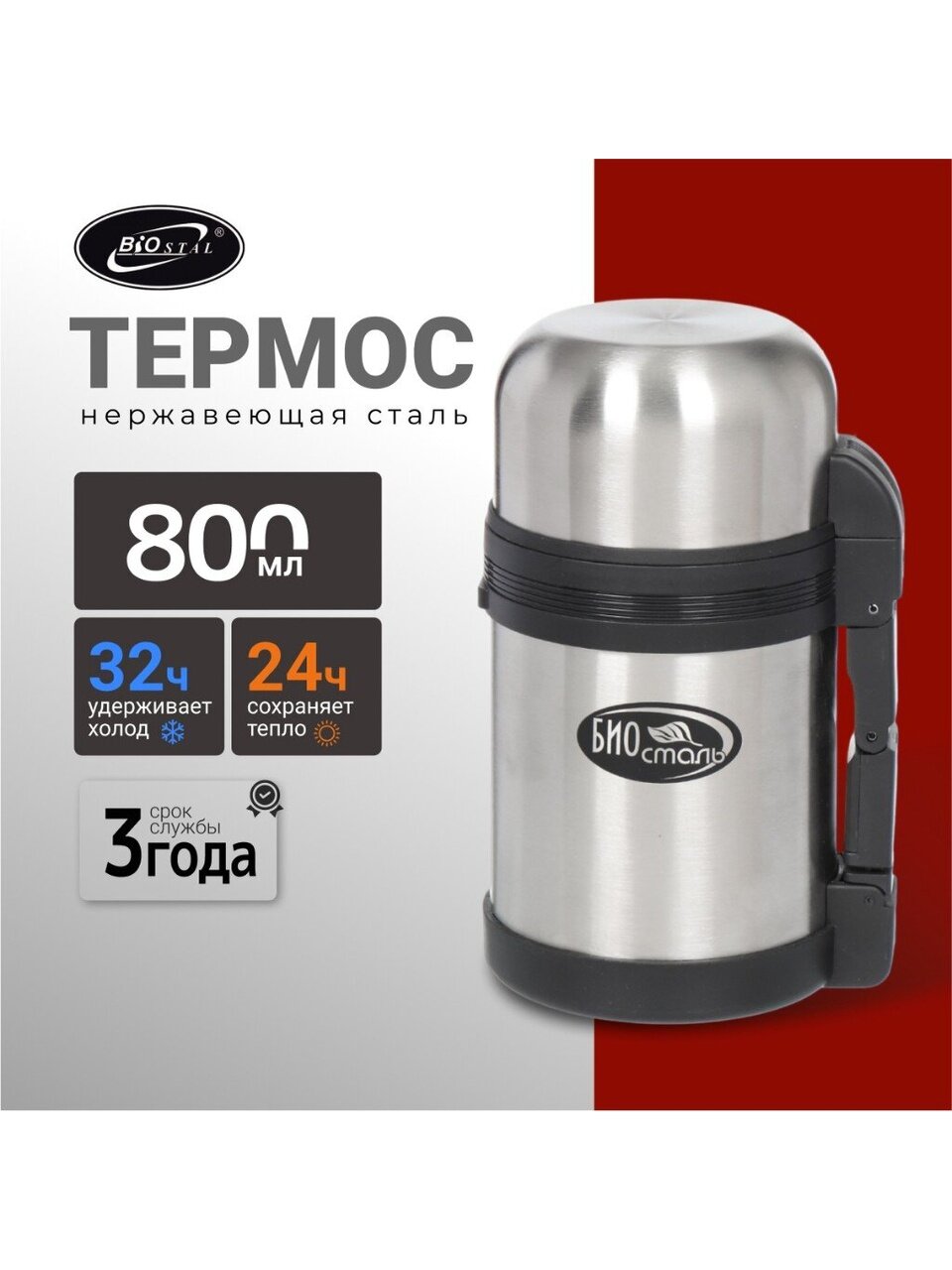 Термос для еды Biostal 0.8 л: держит тепло до 24 часов, ударопрочный, широкая горловина для супов и вторых блюд. Идеален для города, дачи, похода.