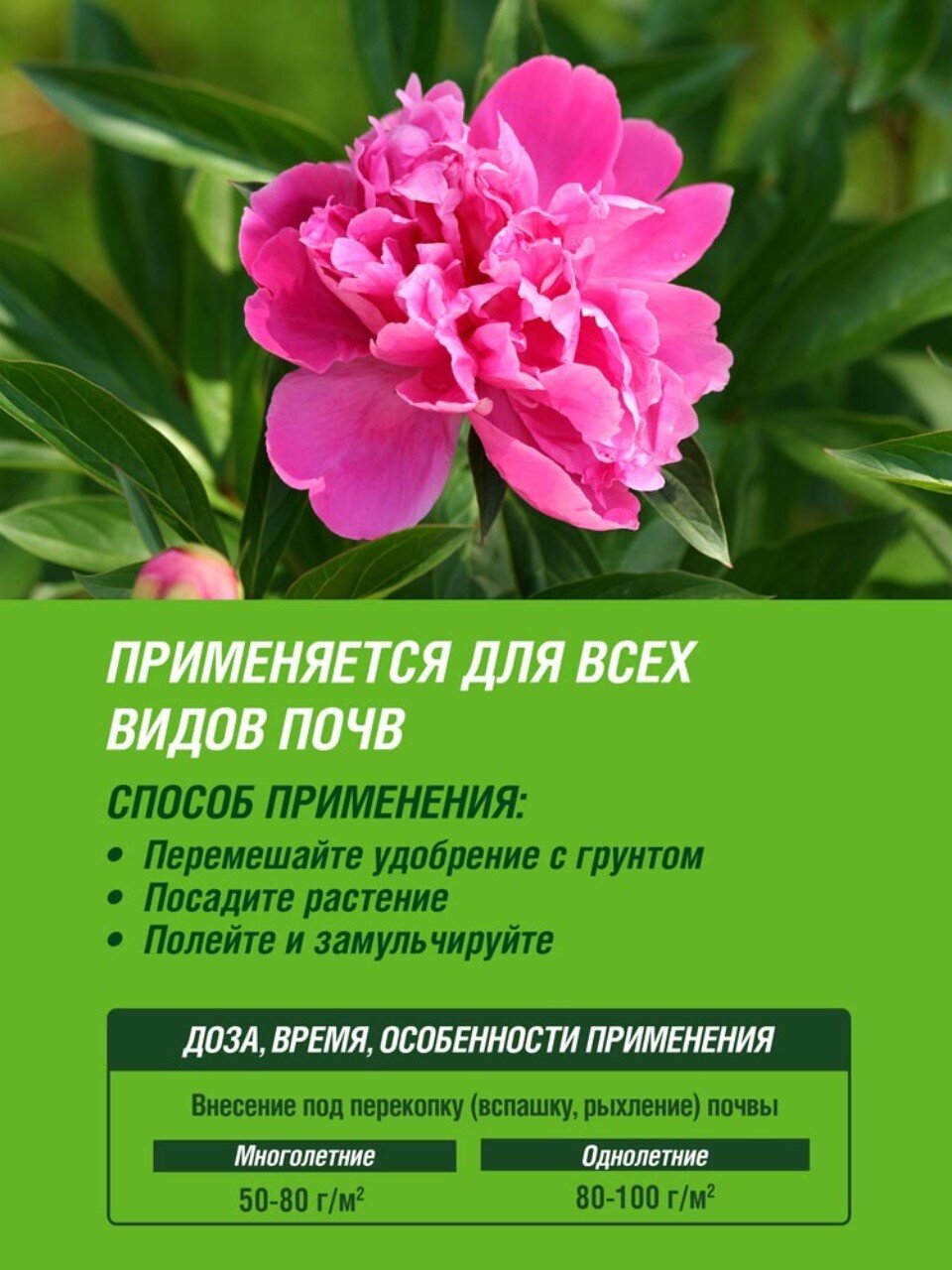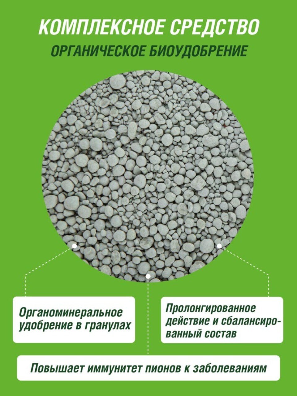 В упаковке 1 кг гранул — этого достаточно для обработки до 50 кустов пионов при стандартной дозировке.