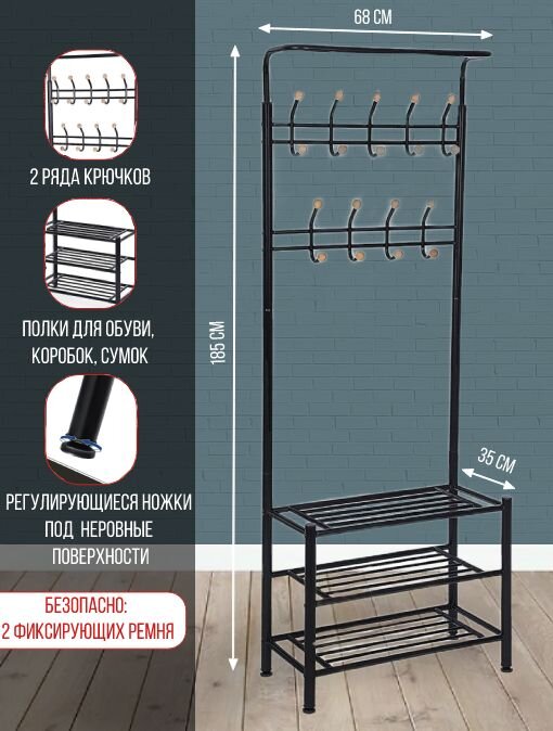 Как использовать: просто соберите по инструкции, разместите в прихожей или гардеробной, распределите одежду на крючках и обувь на нижней полке. Подходит для хранения пальто, курток, аксессуаров и обуви, а также как временное решение для гостей.