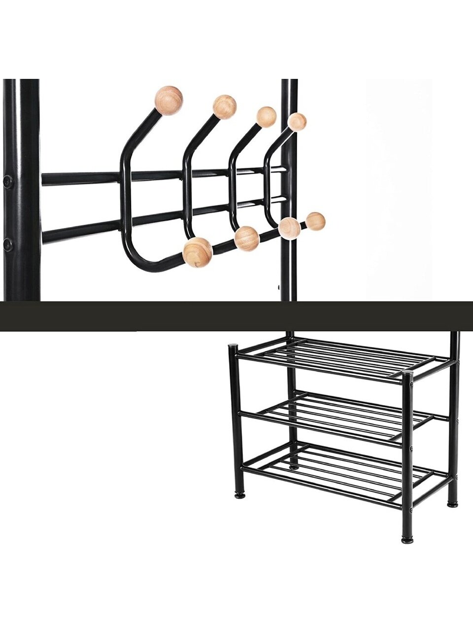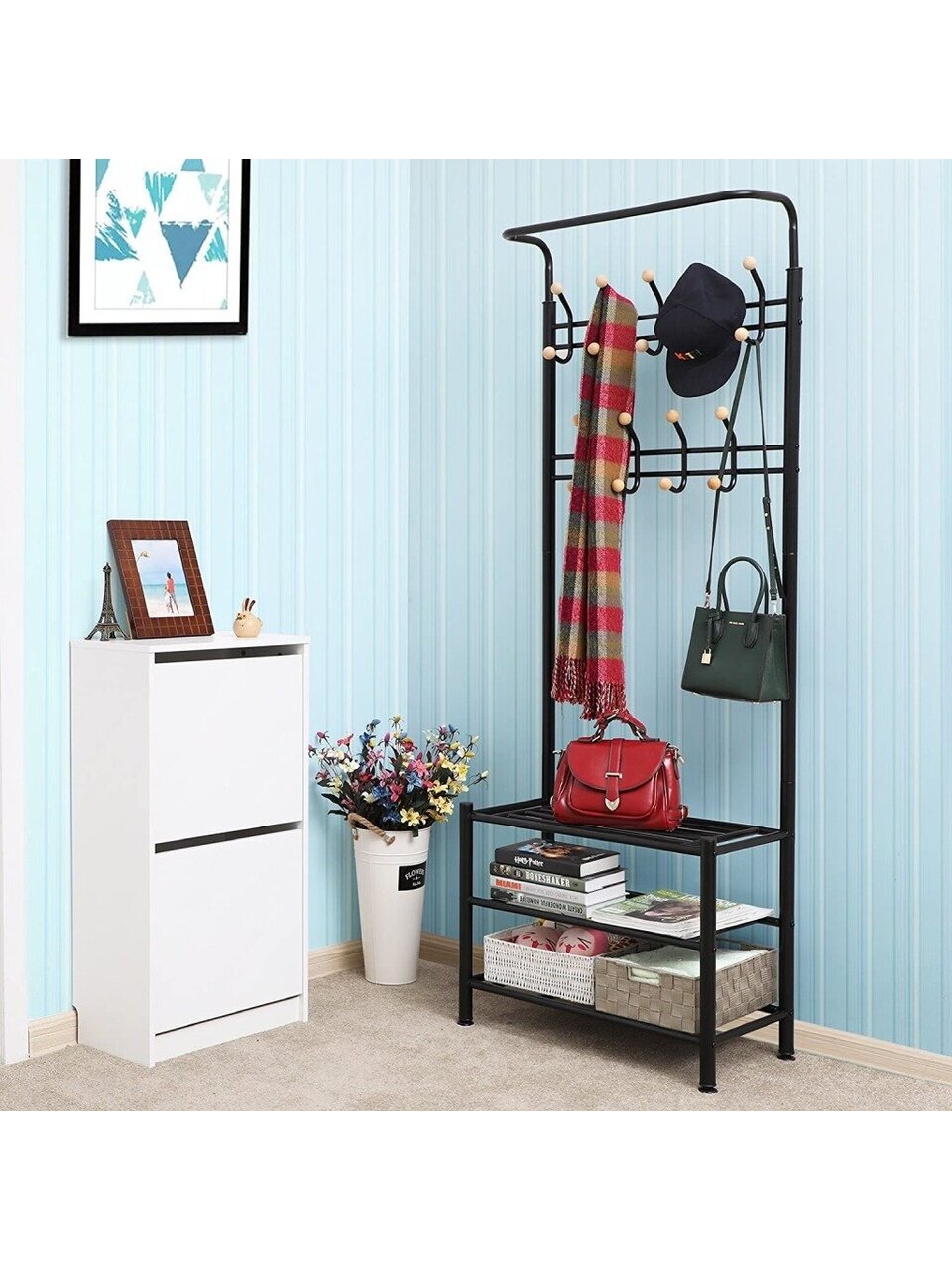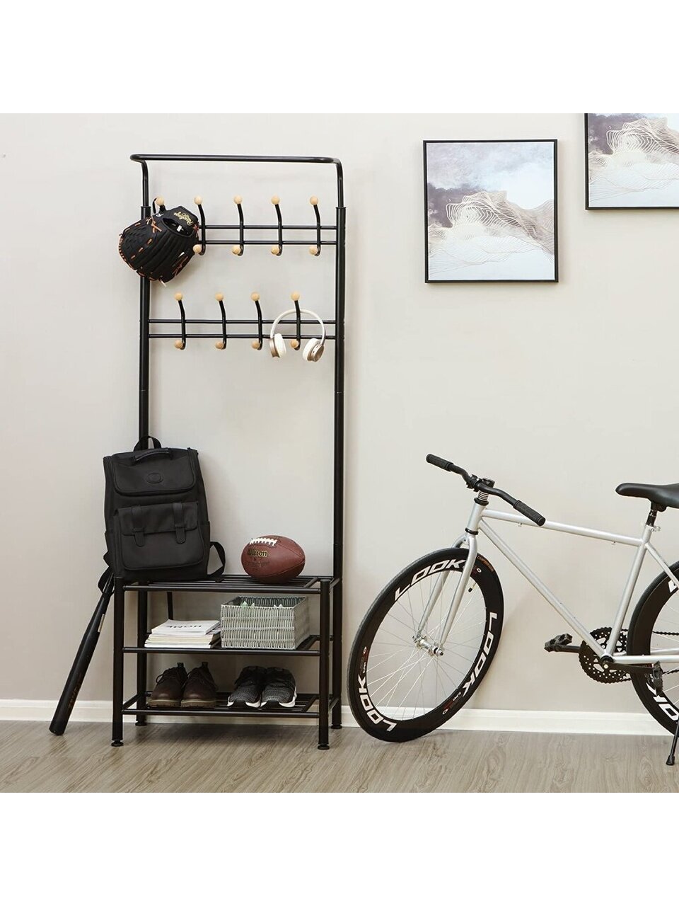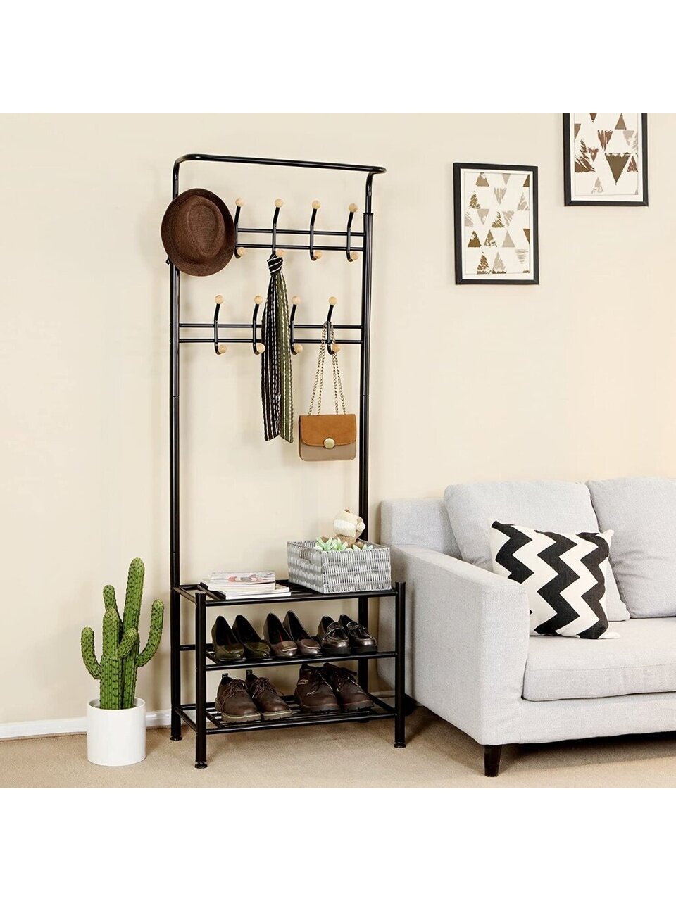 Вешалка Songmics оснащена вместительной полкой для обуви, 9 крючками и выполнена из прочного металла — идеально для организации пространства в доме, на даче или в офисе.