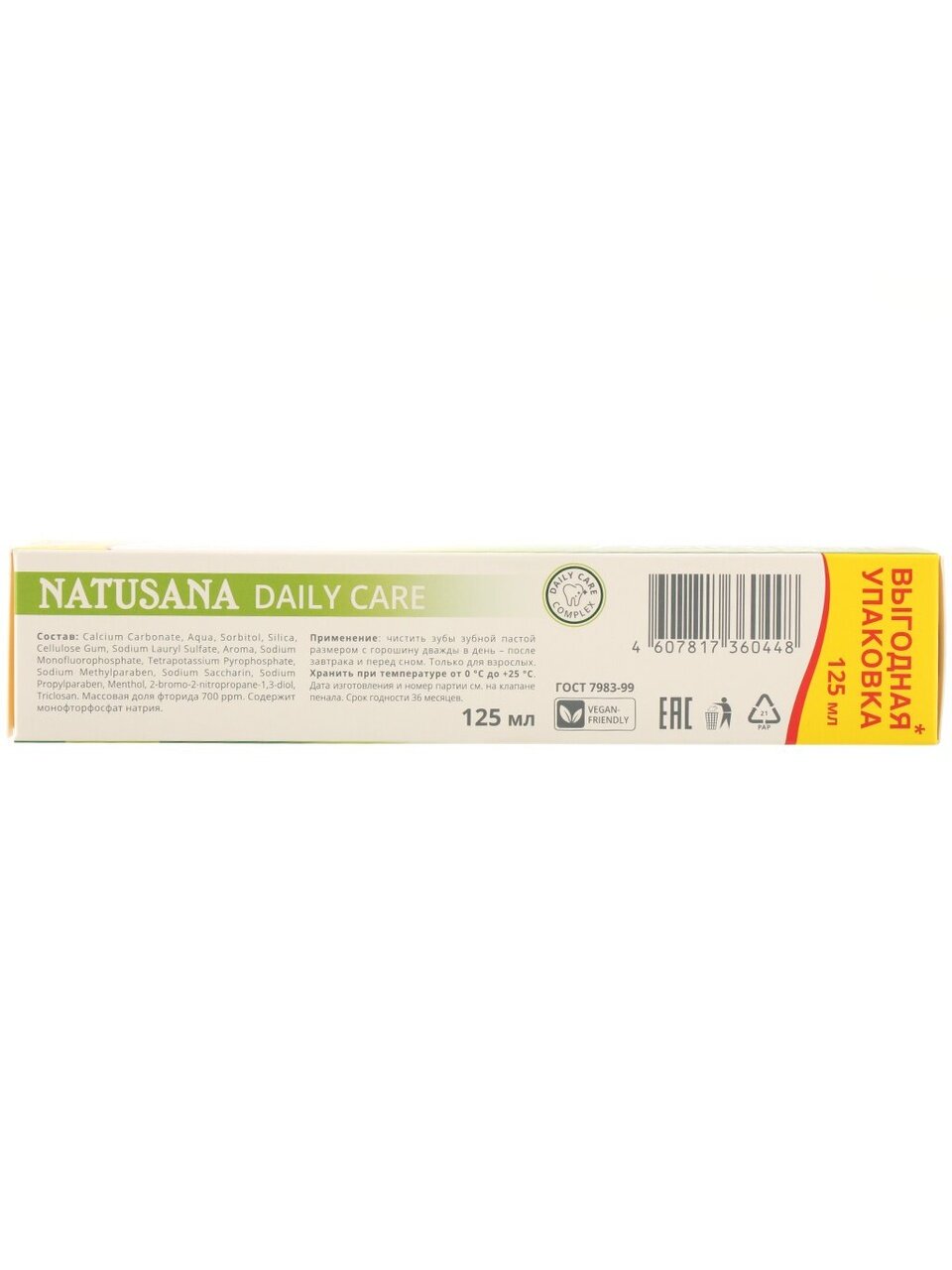 Зубная паста Natusana Daily care, Комплексная защита, 125 мл — современный выбор для эффективного ухода за полостью рта. Комплексная формула обеспечивает надежную защиту зубов и десен, поддерживает свежее дыхание и помогает сохранить здоровье улыбки каждый день. Оптимальный объем тюбика подходит для ежедневного использования всей семьей.
